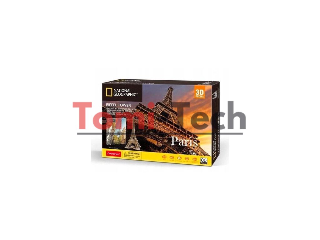 Parížske puzzle s licenciou National Geographic. Balenie obsahuje 222 dielikov puzzle vyrobených zo špeciálneho penového materiálu. Diely puzzle sú očíslované, ryhované a umiestnené na hárky. Jednoducho vytlačte dieliky z hárku bez použitia sily a zostavte ich podľa priloženého návodu, bez potreby lepidla alebo špeciálneho náradia. Rozmery po zostavení sú 29,4 x 29,4 x 70,9 cm. Okrem dielikov puzzle balenie obsahuje aj praktický 28-stranový sprievodca so zaujímavými faktami.