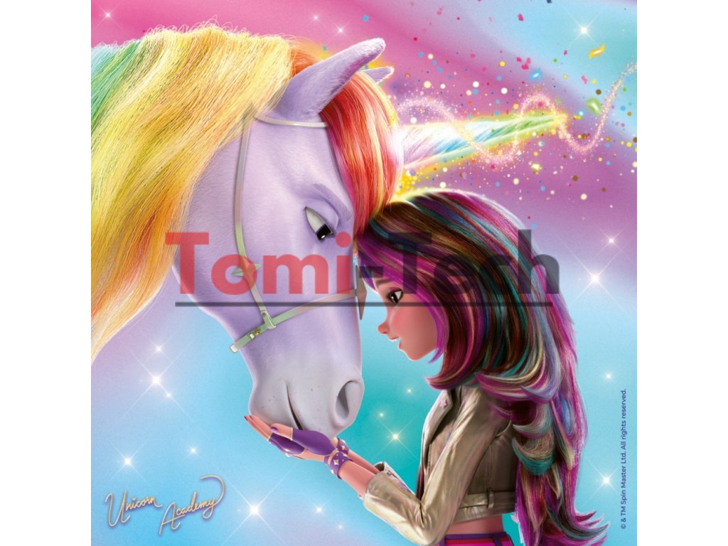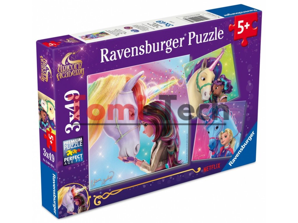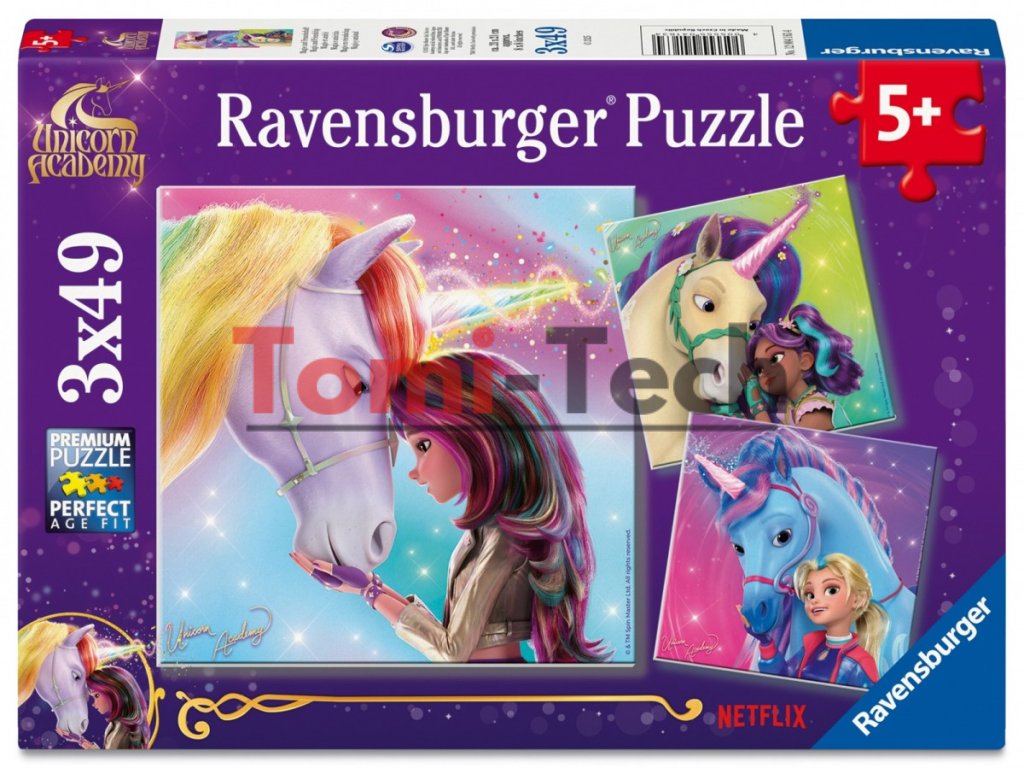 Sada 3 puzzle (každé po 49 dielikov) od Ravensburger s rozmermi 3x49 dielikov zobrazuje postavy z rozprávky Akadémia Jednorožcov.