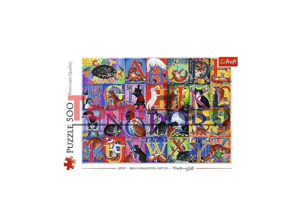 Puzzle s mačacou abecedou sa skladá z 500 dielikov a obsahuje maľovanú koláž písmen a hravých mačiatok. Hotové puzzle má rozmery 480 x 340 mm.