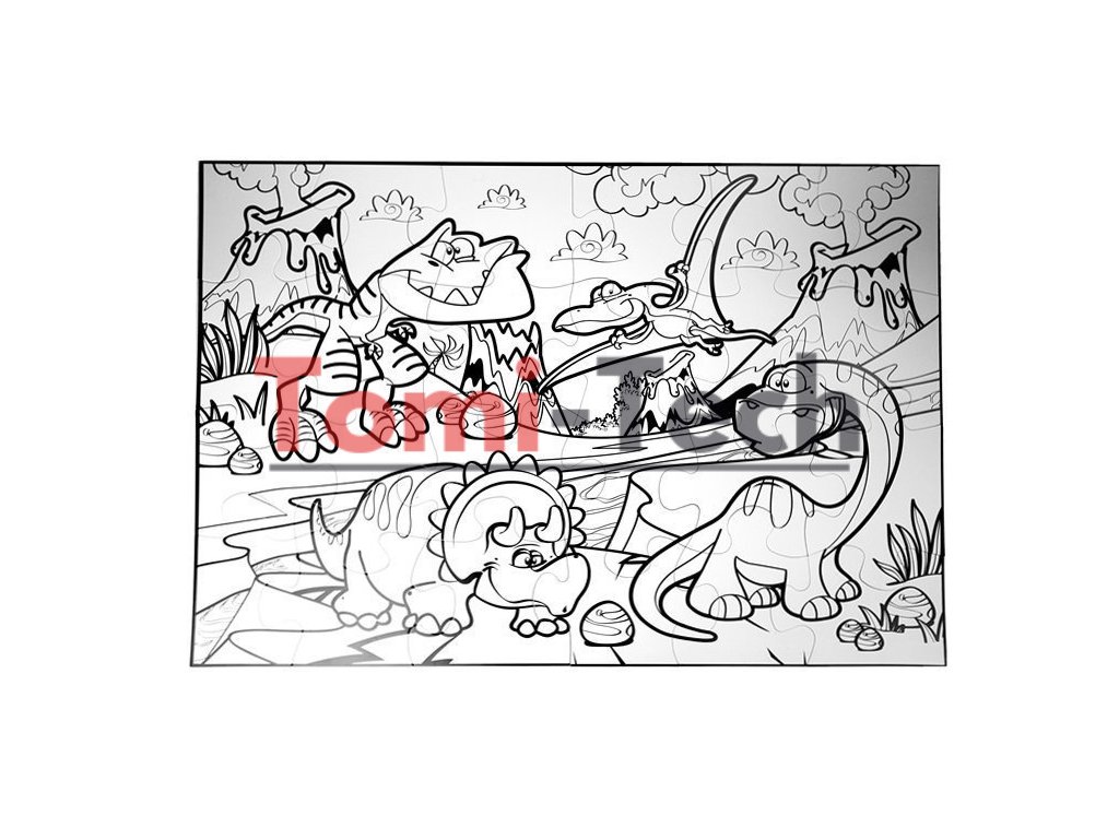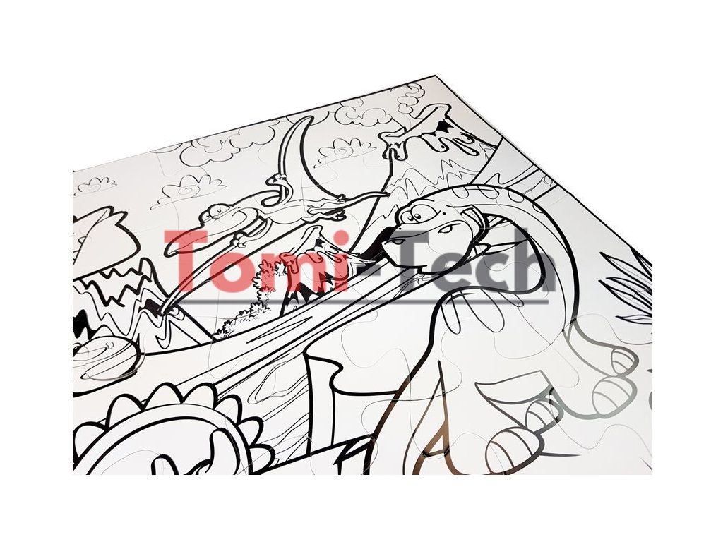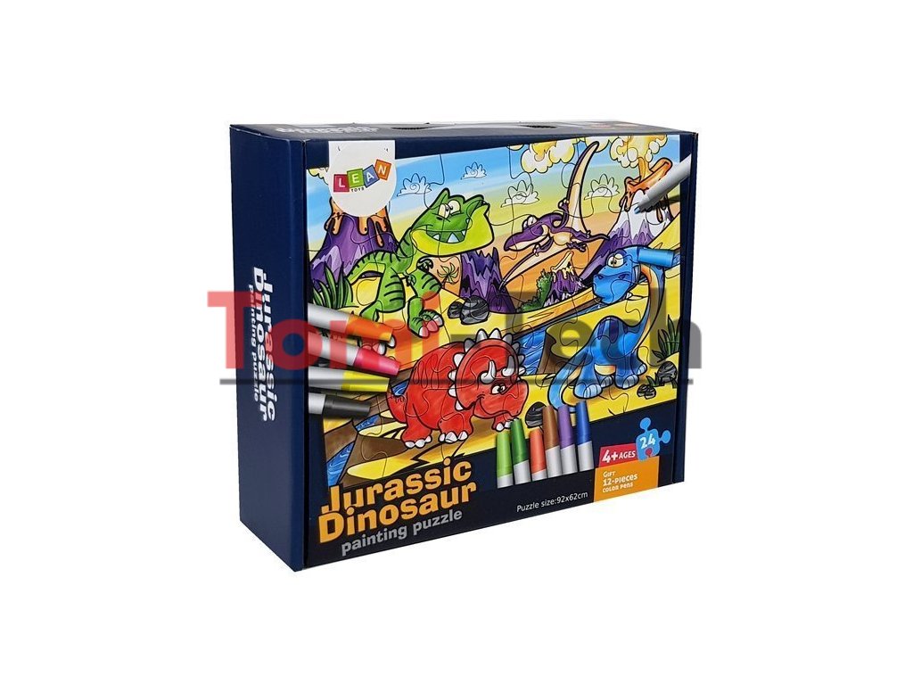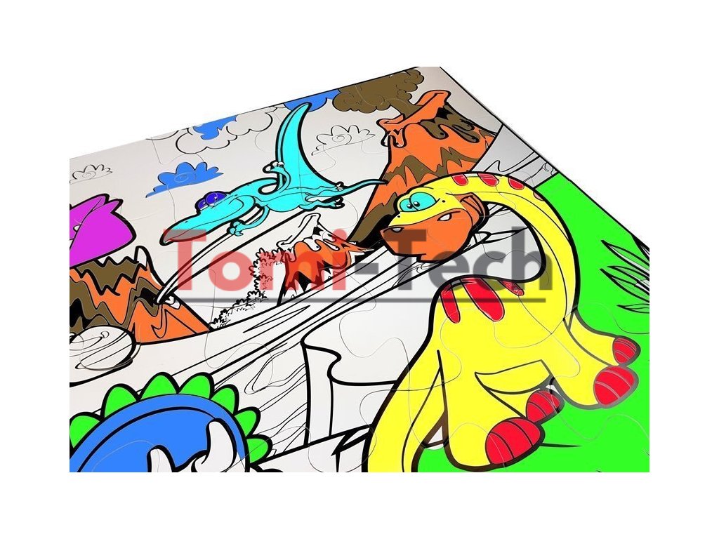 Sada pozostáva z 24 dielikov a 12 fixiek rôznych farieb, ktorými si dieťa môže vyfarbovať. Obrázok zobrazuje dinosaury a prostredie, v ktorom žili. Na bielom pozadí sú vyznačené iba čierne obrysy. Dieťa sa bude môcť dozvedieť o vzhľade a okolí týchto prehistorických zvierat. Rozšíri si vedomosti a pri riešení hádanky si rozvíja manuálne zručnosti.