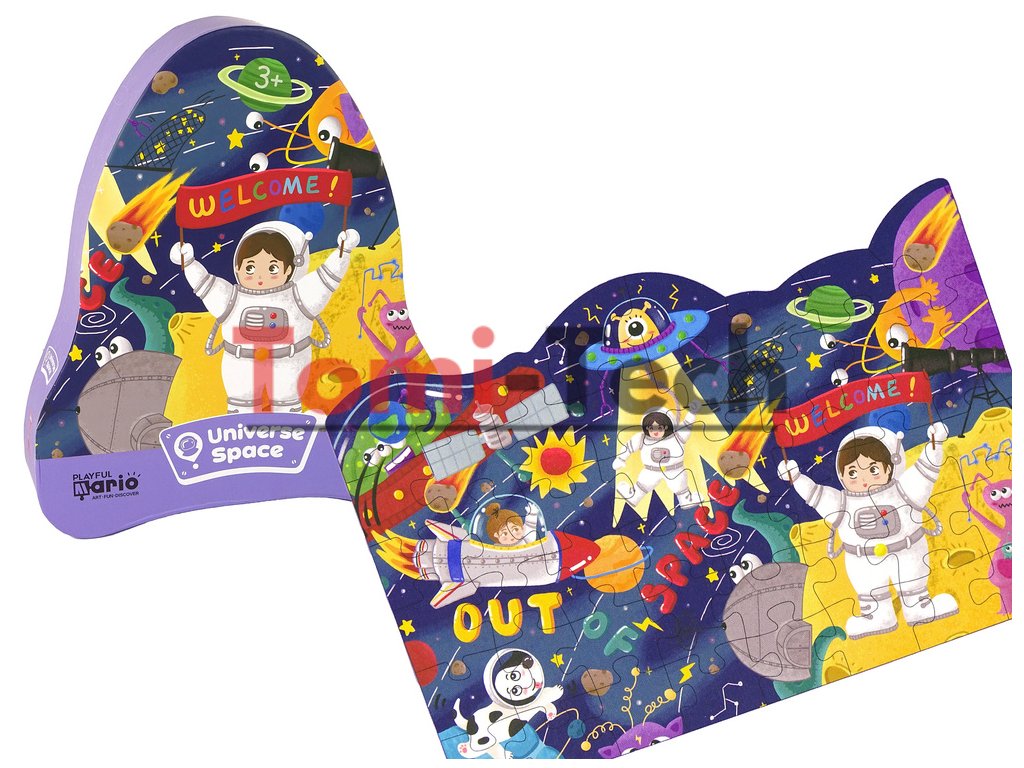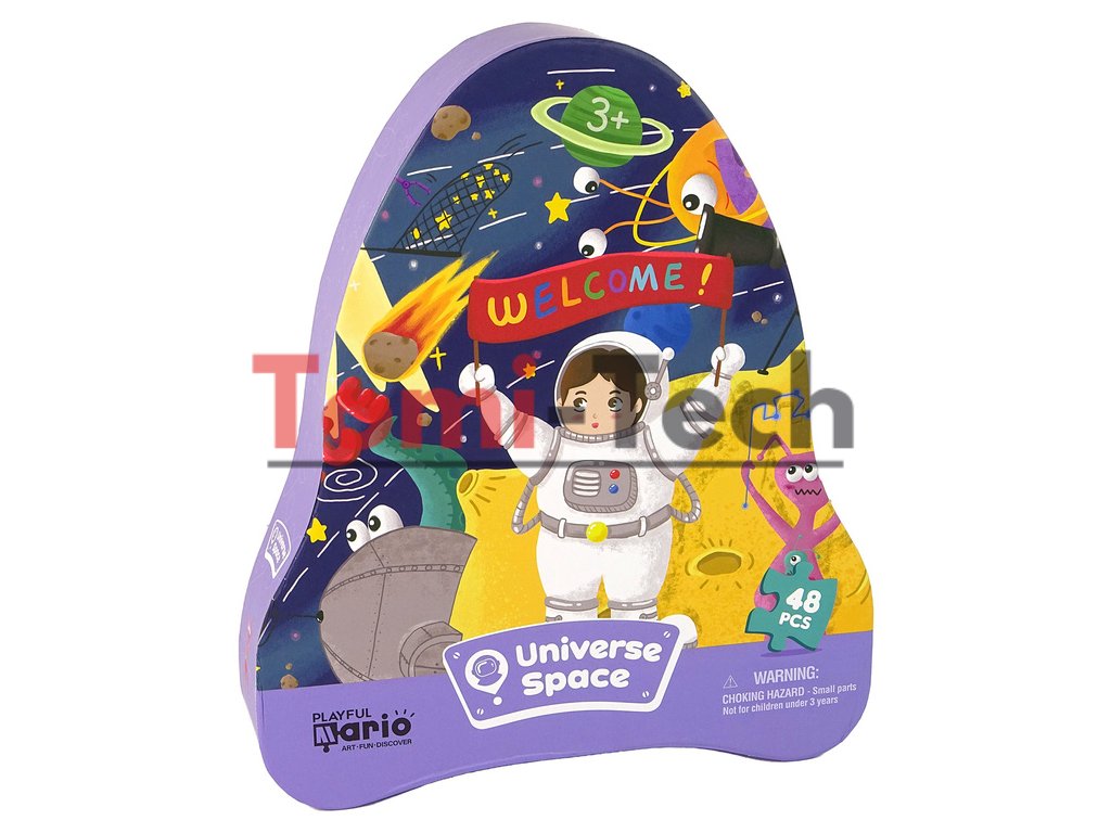 Vesmírne dobrodružstvá ožívajú s touto sadou puzzle! Táto 48-dielna sada puzzle je určená pre deti od 3 rokov. Po zložení tohto fascinujúceho puzzle získate obrázok s pôsobivými rozmermi 50 cm x 34 cm, ktorý zobrazuje vesmírnu scenériu s kozmonautom, priateľskými mimozemšťanmi, raketou a tajomnými planétami v pozadí.