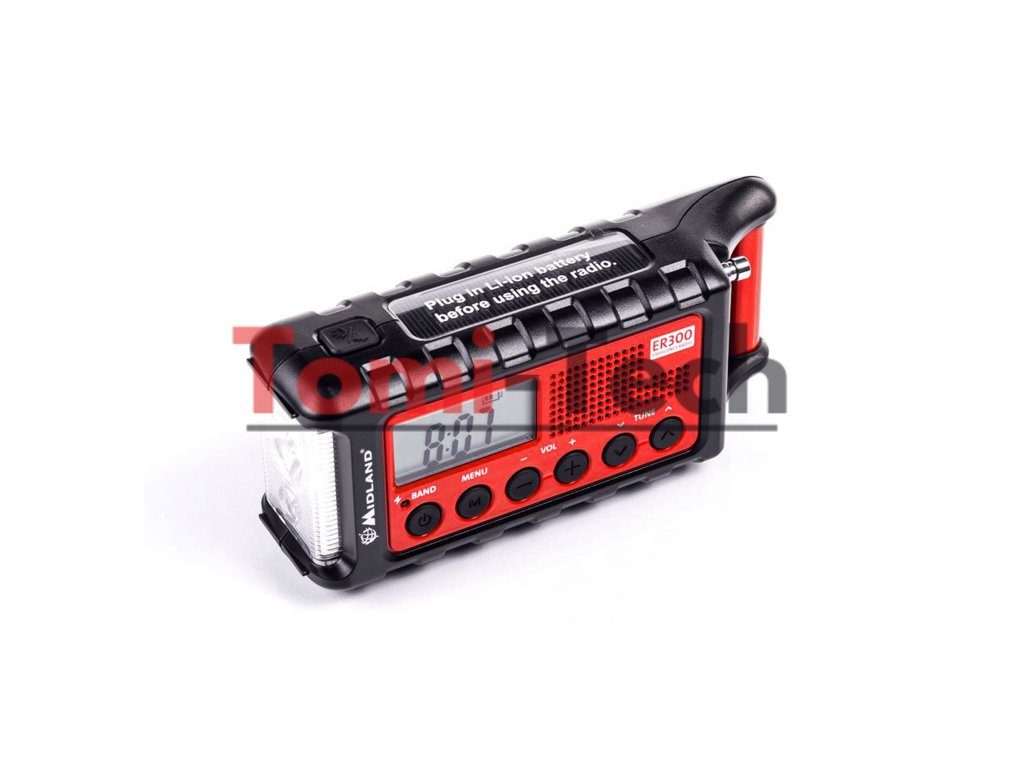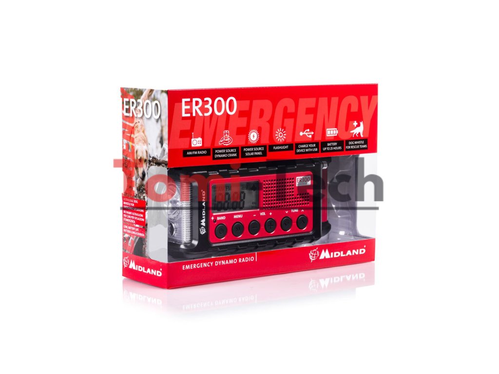 Rádio Midland ER300 je výkonná powerbanka s možnosťou nabíjania prenosných zariadení. Núdzové zariadenie vybavené prijímačom AM/FM je určené pre núdzové situácie, katastrofy a bezpečnostné situácie, kde je nevyhnutný neustály kontakt. ER300 je tiež všestranným riešením pre každodenné použitie, outdoorové aktivity, kempovanie alebo všeobecné voľnočasové aktivity. Môže sa nabíjať pomocou dynama, solárneho panela, batérií alebo USB portu. Obsahuje tiež ultrazvukový zosilňovač pre psov a baterku. Sada obsahuje: núdzovú rádio Midland ER300, USB kábel, lítium-iónovú batériu Midland 18600 s kapacitou 2600 mAh. FUNKCIE: 3 ekologické zdroje energie: DYNAMO - ručná kľuka, USB alebo solárny panel, výkonné baterka s LED diódami Cree. (130 lúmenov) s nastaviteľným jasom pre šetrenie batérie. Mobilná powerbanka: Elektronické zariadenia je možné nabíjať cez USB výstup. Ultrazvuková píšťalka pre psov: Pomáha záchranným tímom lokalizovať osoby v núdzi. Funkcia SOS Morseova abeceda: Odošlite vizuálne núdzové volanie pomocou baterky v Morseovej abecede. Midland ER 300 je skutočne všestranné zariadenie: toto kompaktné vonkajšie rádio udržiava poslucháčov v obraze aj na cestách, bez externého zdroja napájania. Ako solárne alebo ručne napájané rádio je ideálne pre rôzne outdoorové aktivity – či už ide o turistiku, lyžovanie, kempovanie, pláž alebo len tak v každodennom živote. Aj na pikniku v prírode rádio spoľahlivo zabáva hudbou (príjem rozhlasových staníc FM a AM). Aj v nebezpečných situáciách, ako je búrka, je spoľahlivým spoločníkom a poskytuje užitočné informácie ako núdzové rádio. TECHNICKÉ ÚDAJE: Frekvencia: 531 ? 1629 kHz (AM) / 87,5 - 108 MHz (FM) Napájanie: lítium-iónová batéria typ 18600 (3,7 V - 2600 mAh) alebo 6 batérií typu AA alebo nabíjateľné batérie Prevádzková teplota: od 20 do +55 °C Hmotnosť: 470 g (vrátane lítium-iónovej batérie) Rozmery: 192 x 86 x 57 mm Vlastnosti: FM/AM rádio Vymeniteľná nabíjateľná batéria Veľký, jasný LCD displej s ukazovateľom času a podsvietením 3,5 mm konektor pre slúchadláDodatočné parametre
