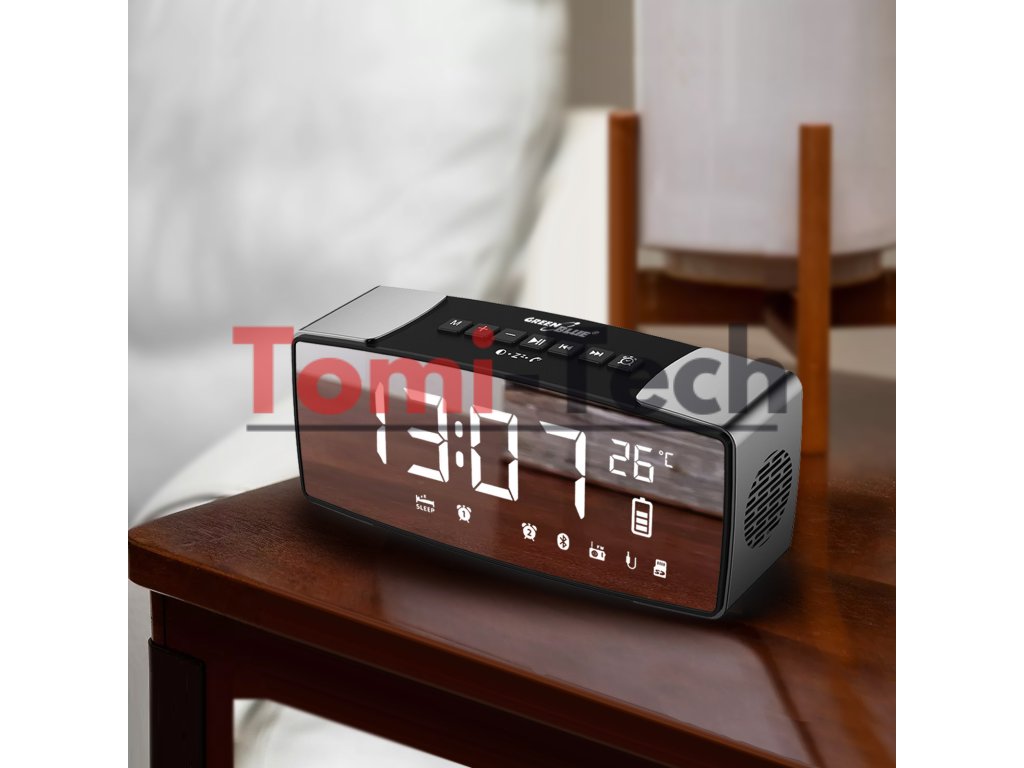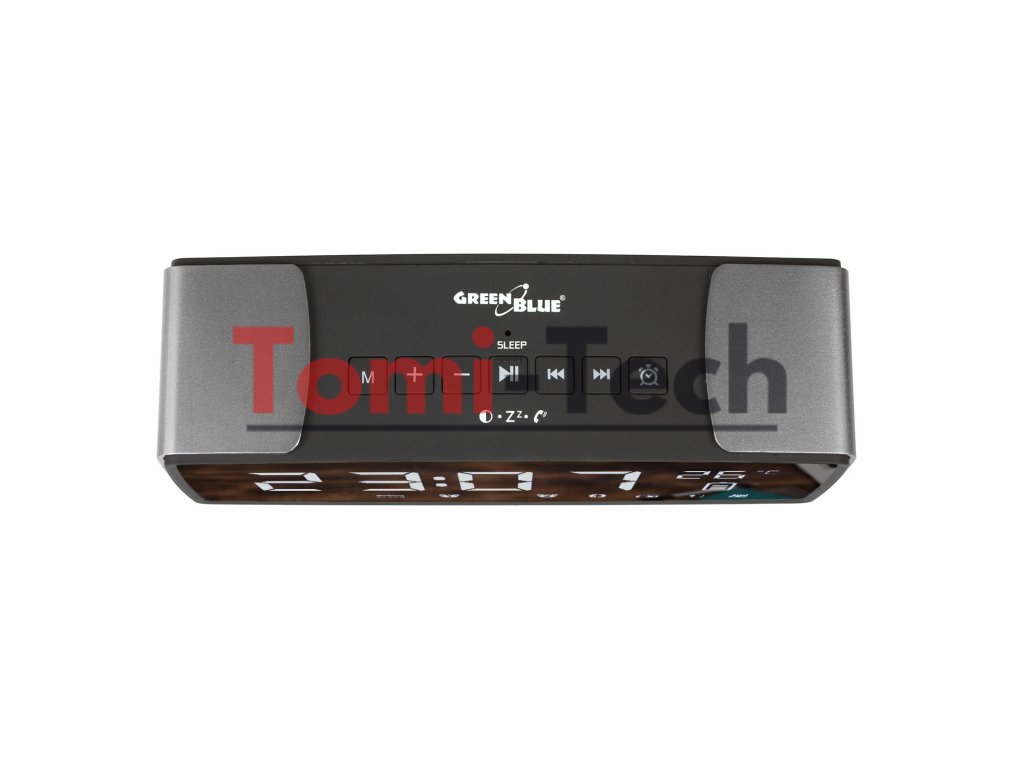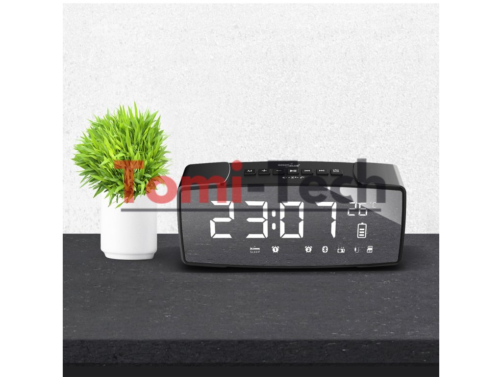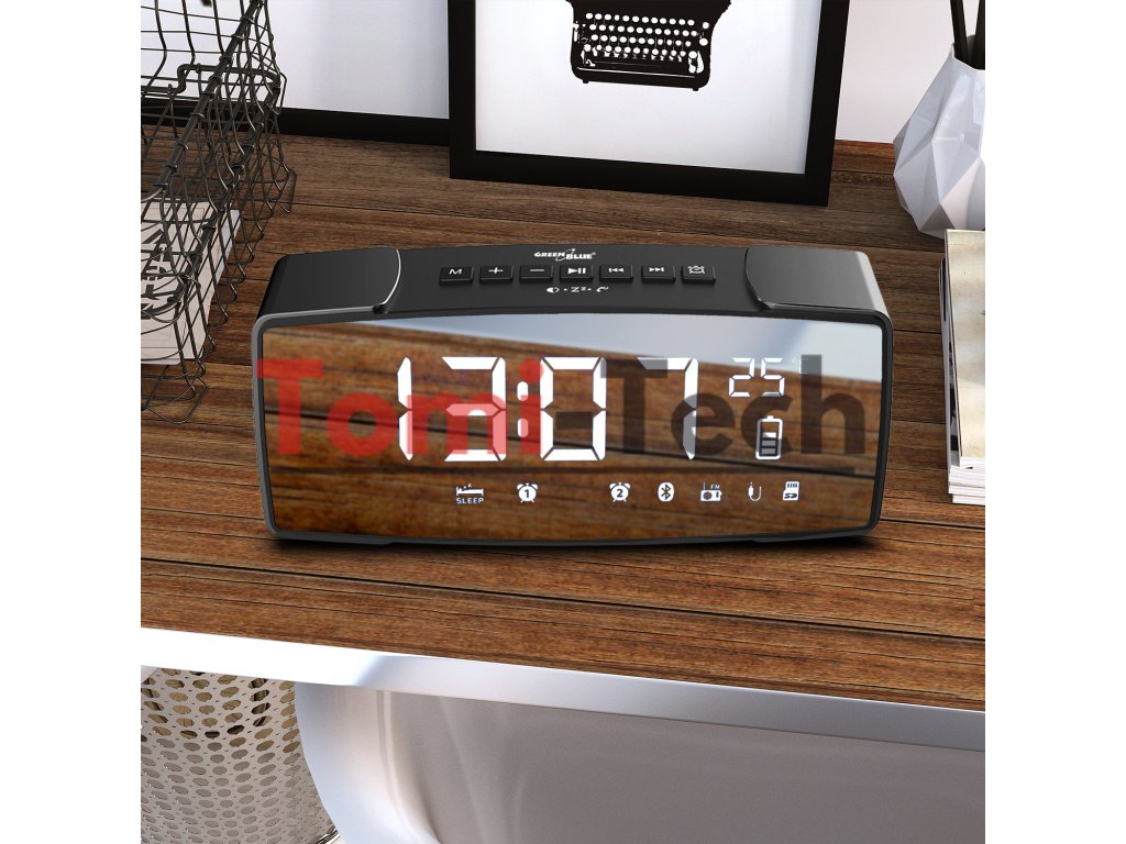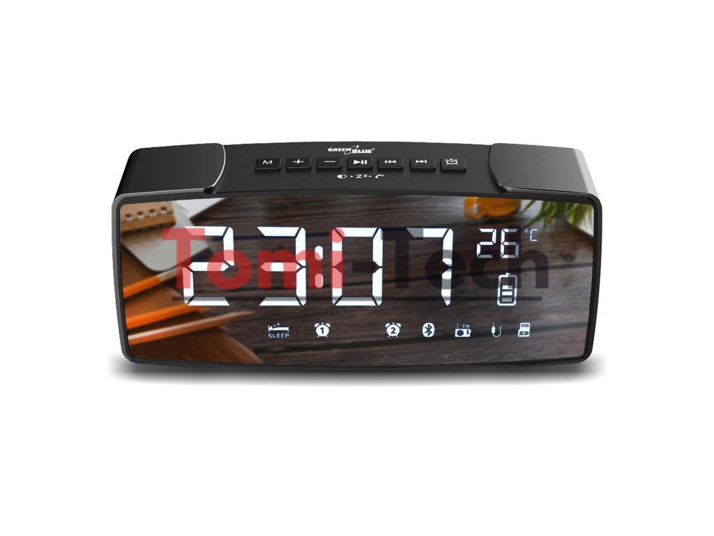 GreenBlue GB200 je moderný rádiobudík vybavený veľkou zrkadlovou obrazovkou, vďaka čomu je perfektným doplnkom do každého interiéru, či už klasického alebo moderného. Veľké číslice zaisťujú čitateľnosť aj z diaľky a vstavaný senzor zobrazuje okolitú teplotu.