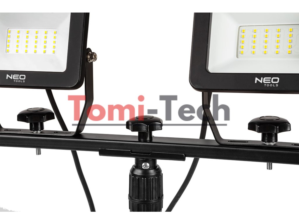 Jednoduché bodové svietidlo NEO, výkon 2 x 50W, 8500 lúmenov, 230V 50Hz, SMD LED, prevádzková doba 25 000h, 6500K, hliníkové telo, IP65, CRI Ra 80, uhol vyžarovania 120 stupňov, ZAP/VYP 15 000 cyklov, kábel so zástrčkou 3m, prevádzková teplota -25<>+45, účinník >0,9, doba zahrievania na 60% <1s, teleskopický statív max. 1,8Dodatočné parametre