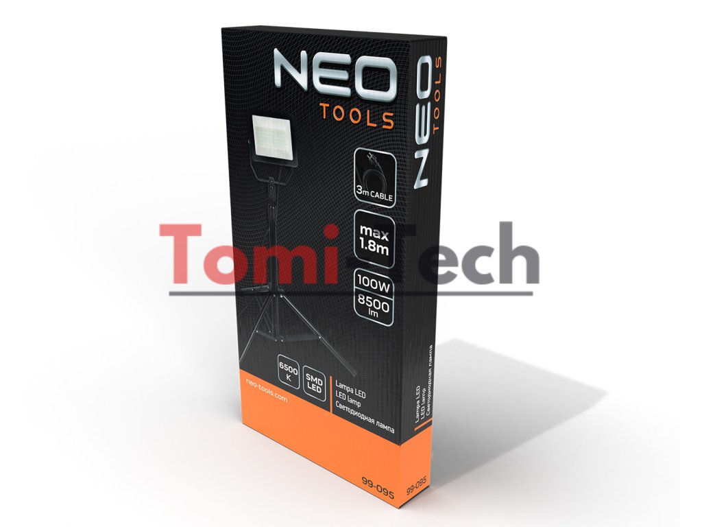 Jednoduché bodové svietidlo NEO, výkon 100 W, 8500 lúmenov, 230 V 50 Hz, SMD LED, prevádzková doba 25 000 h, 6500 K, hliníkové telo, IP65, CRI Ra 80, uhol vyžarovania 110 stupňov, ZAP/VYP 15 000 cyklov, kábel so zástrčkou 3 m, prevádzková teplota -25 °C<>+45 °F, účinník >0,9, doba zahrievania na 60 % <1 s, teleskopický statív max. 1,8Dodatočné parametre