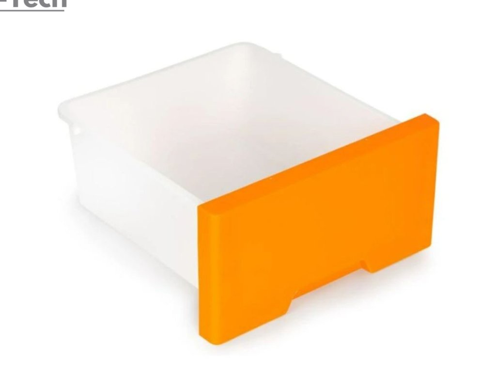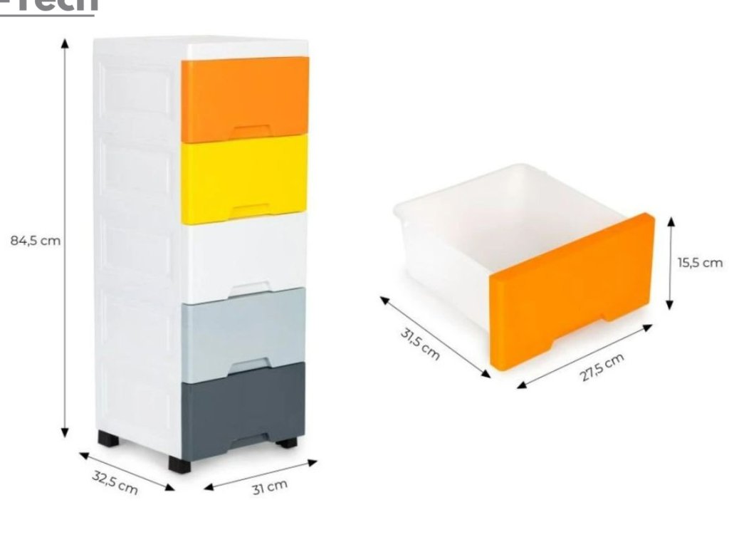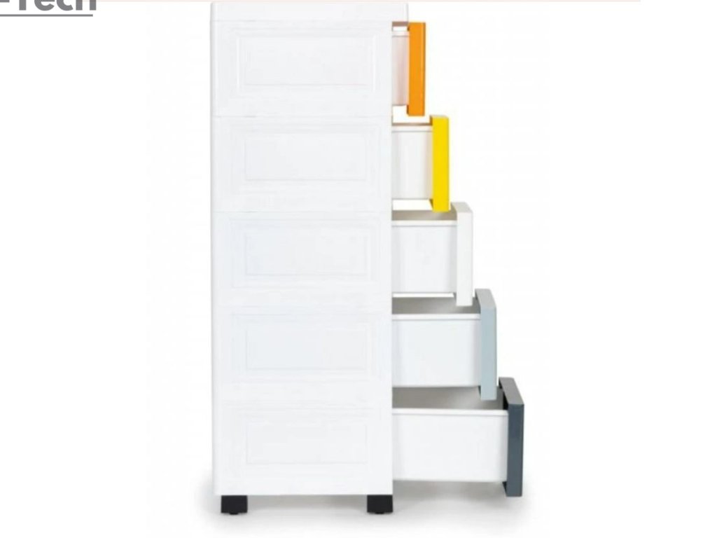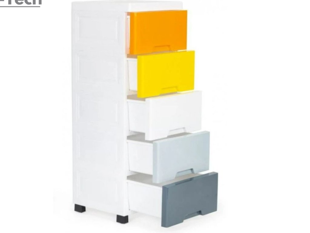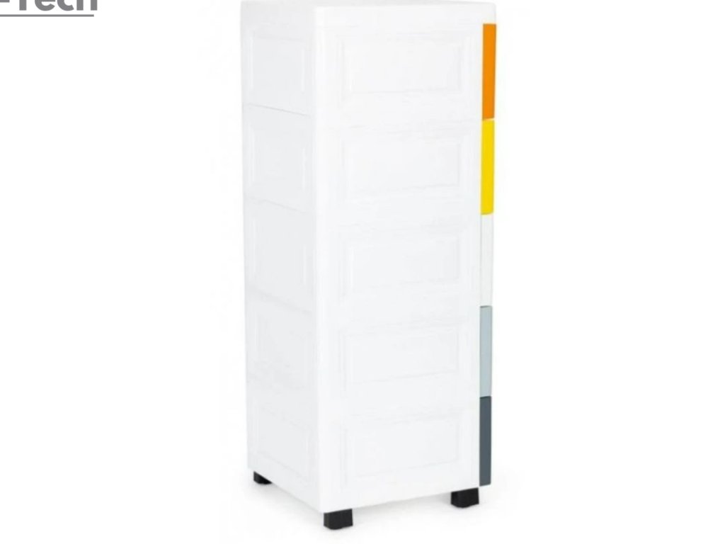 - Regál pozostáva z piatich farebných zásuviek, so špeciálne profilovanou rukoväťou na prednej strane, ktorá uľahčuje ich zasúvanie a vysúvanie.