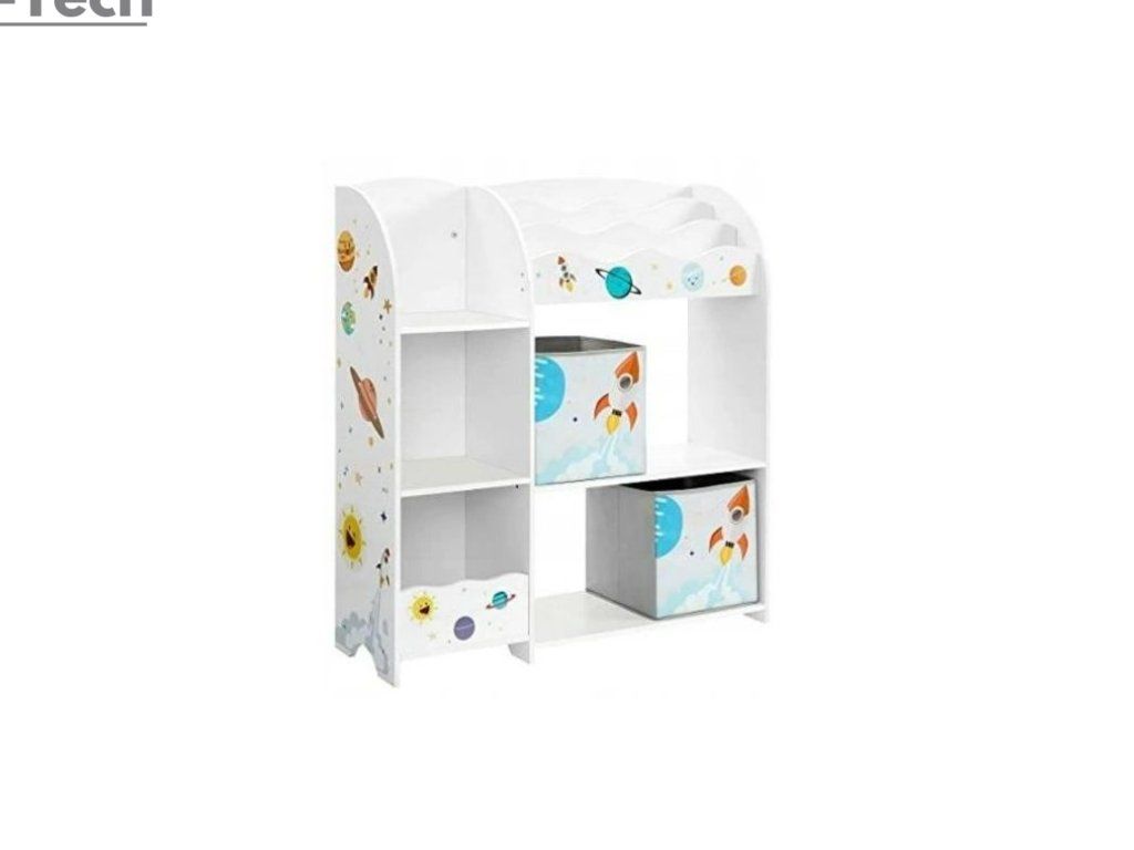 - Detská polica sa skladá z 3 priehradok na knihy, 5 políc na plyšové hračky a 2 boxov na iné drobnosti.