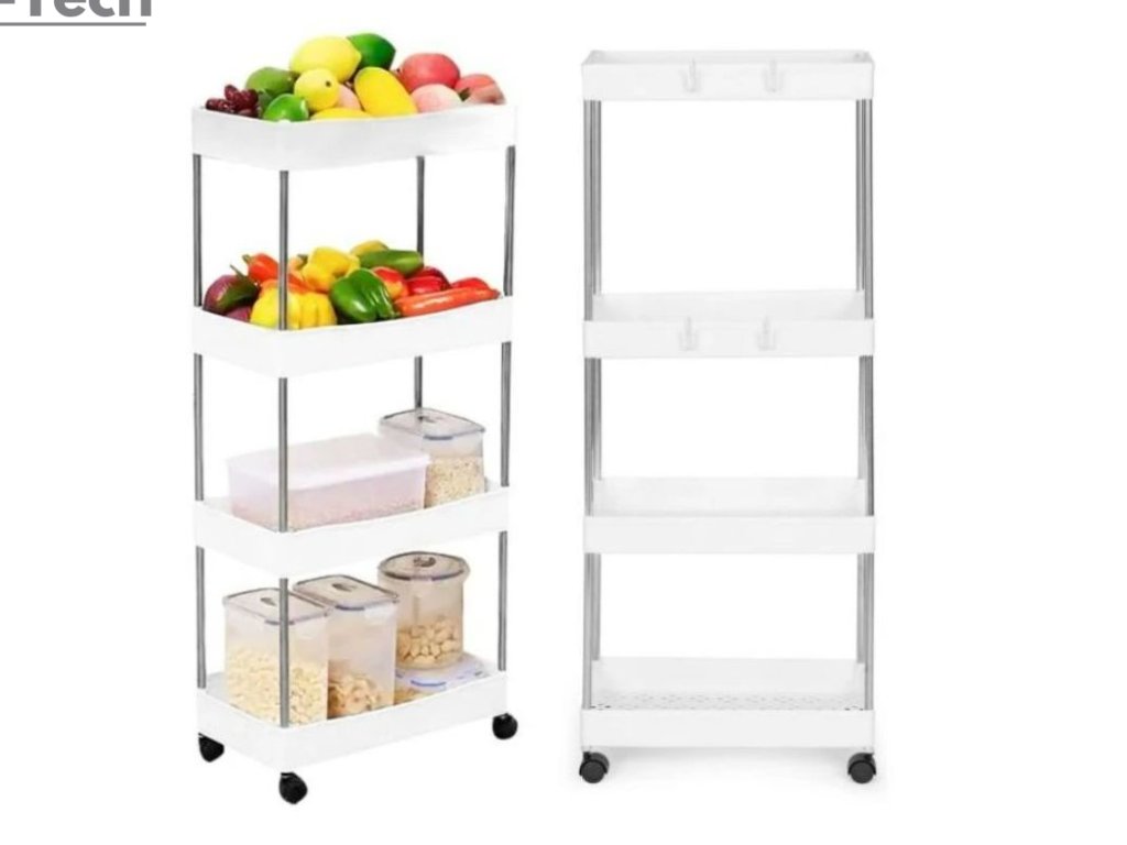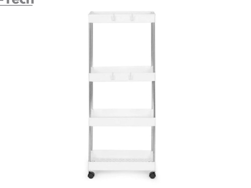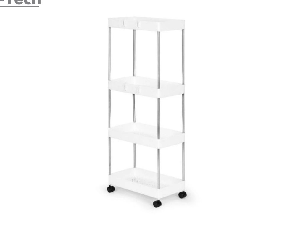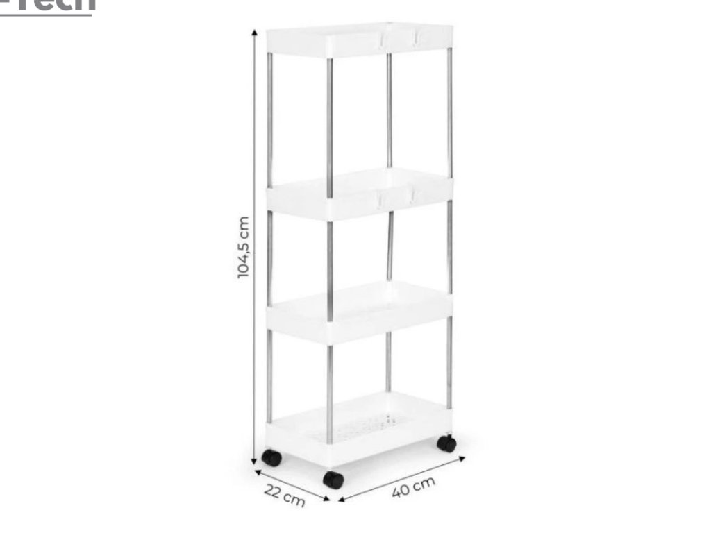 Regál na kolieskach je skvelý kus nábytku do každej domácnosti, ktorý efektívne využijete. Regál so štyrmi policami a s pevnou plastovou konštrukciou, využijete ako regál na odkladanie rôznych kozmetických, dekoračných predmetov. Ide o plastový regál vybavený štyrmi policami, ktorý poskytuje dostatok priestoru na odkladanie rôznych kúpeľňových predmetov, ako je kozmetika, uteráky a hygienické potreby. Ďalšou výhodou sú pripevnené vešiaky a kolieska, ktoré uľahčujú premiestňovanie police. Jeho stabilná a ľahká konštrukcia mu dodáva odolnosť a moderný vzhľad.