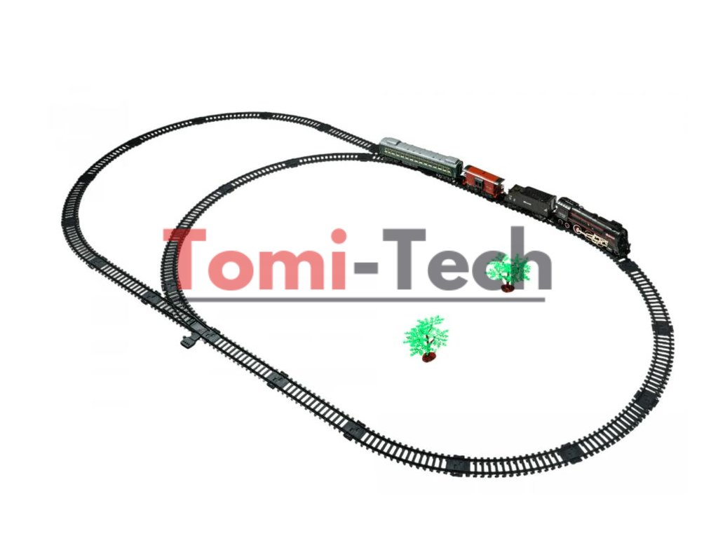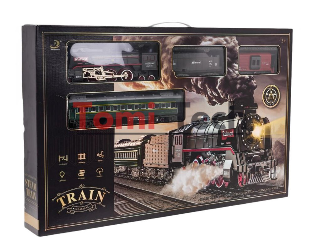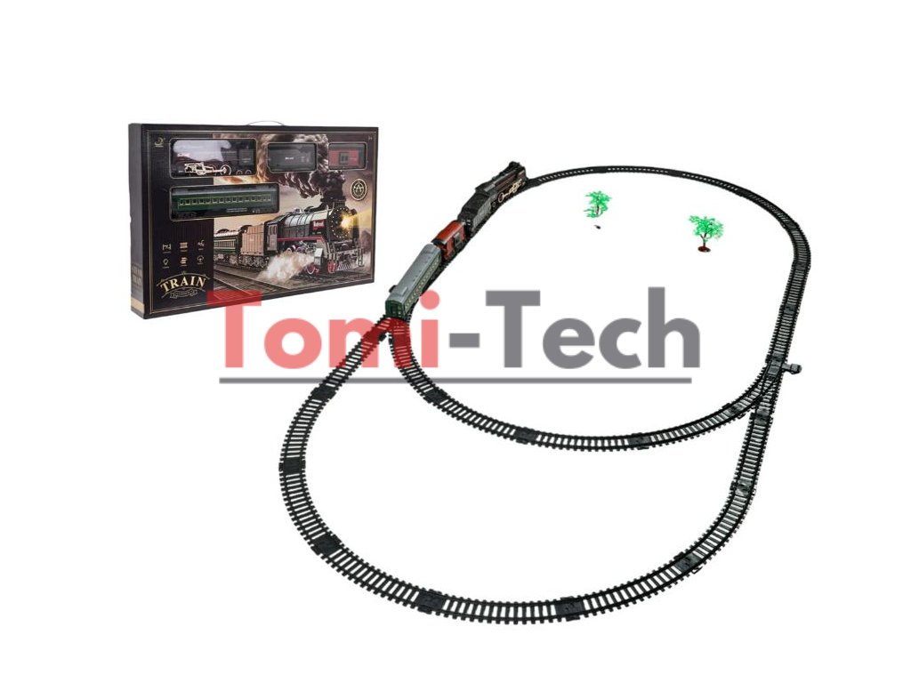 Retro súprava vláčika s dymovou funkciou a zvukmi jazdy, ako aj dráhami, ktoré sú súčasťou súpravy. Počas jazdy lokomotíva vypúšťa dym z komína a po stranách (po naplnení vodou - súčasťou súpravy je vodná pipeta) a svieti aj svetlo inštalované v prednej časti.