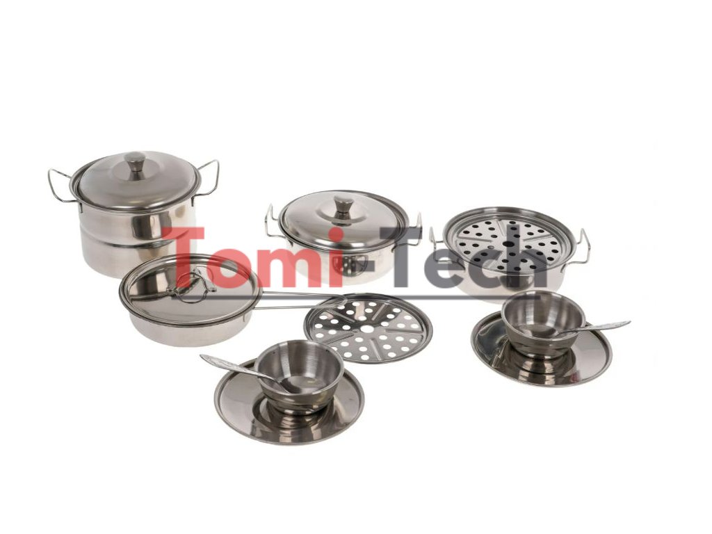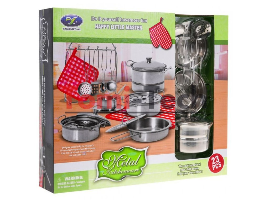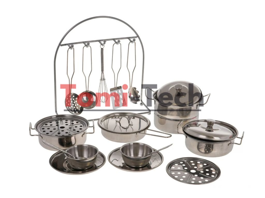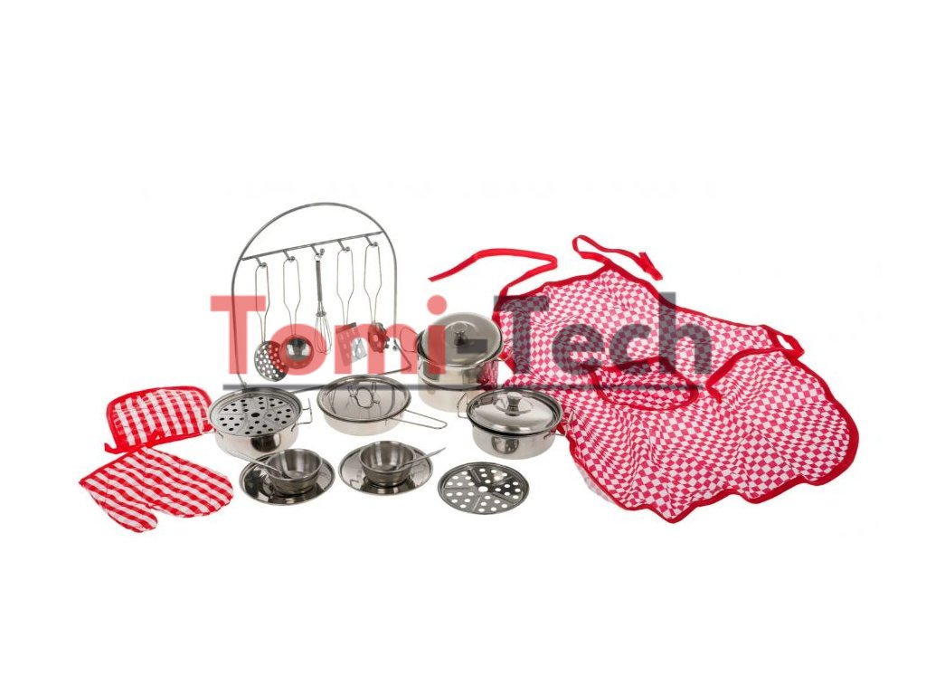 Sada sa skladá z mnohých prvkov potrebných v každej detskej kuchynke. K dispozícii sú hrnce s pokrievkami, kuchynské náčinie, kuchárska zástera, chňapka, taniere, lyžice atď. Vyrobené z kovu, zaručuje odolnosť a pevnosť.