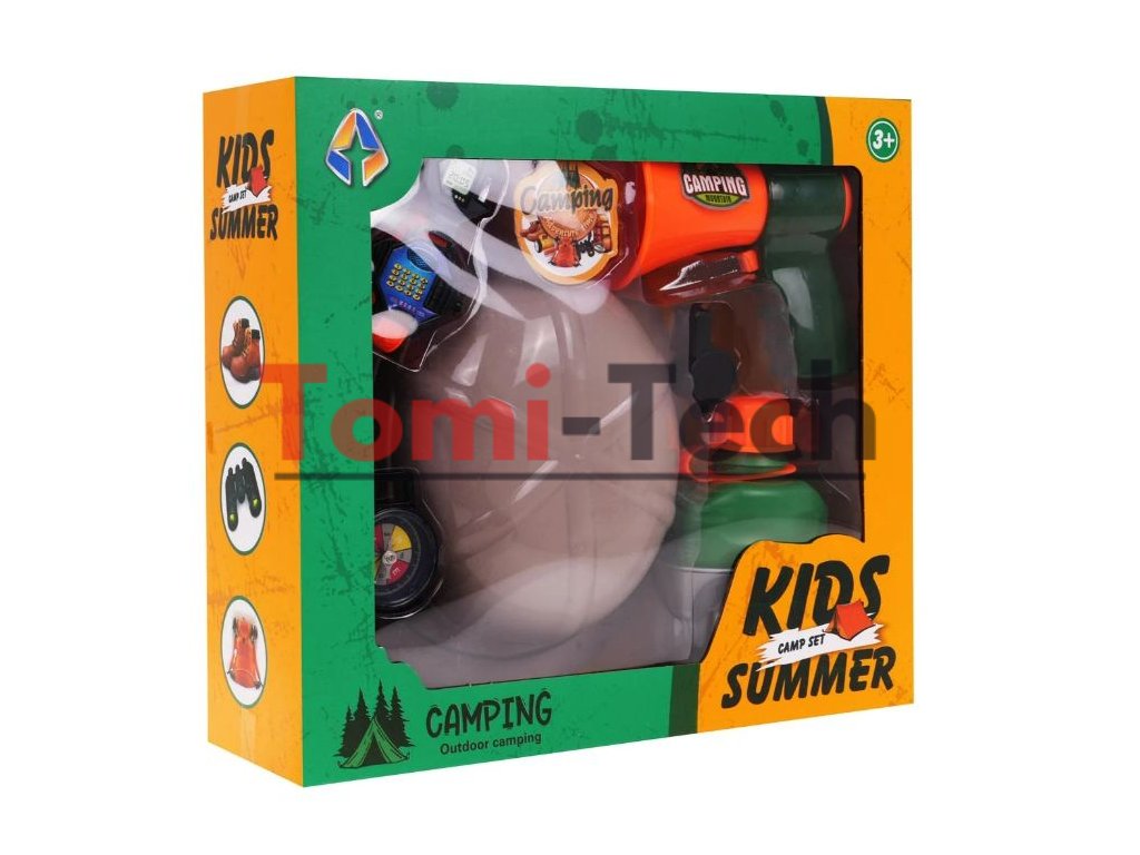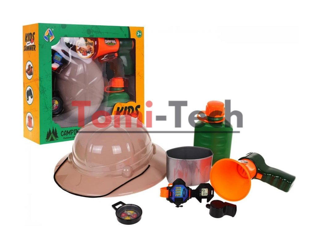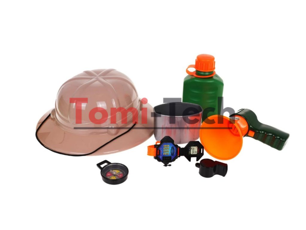 Obsah sady: klobúk, fľaša na vodu, megafón, hodinky, kompas a píšťalka.