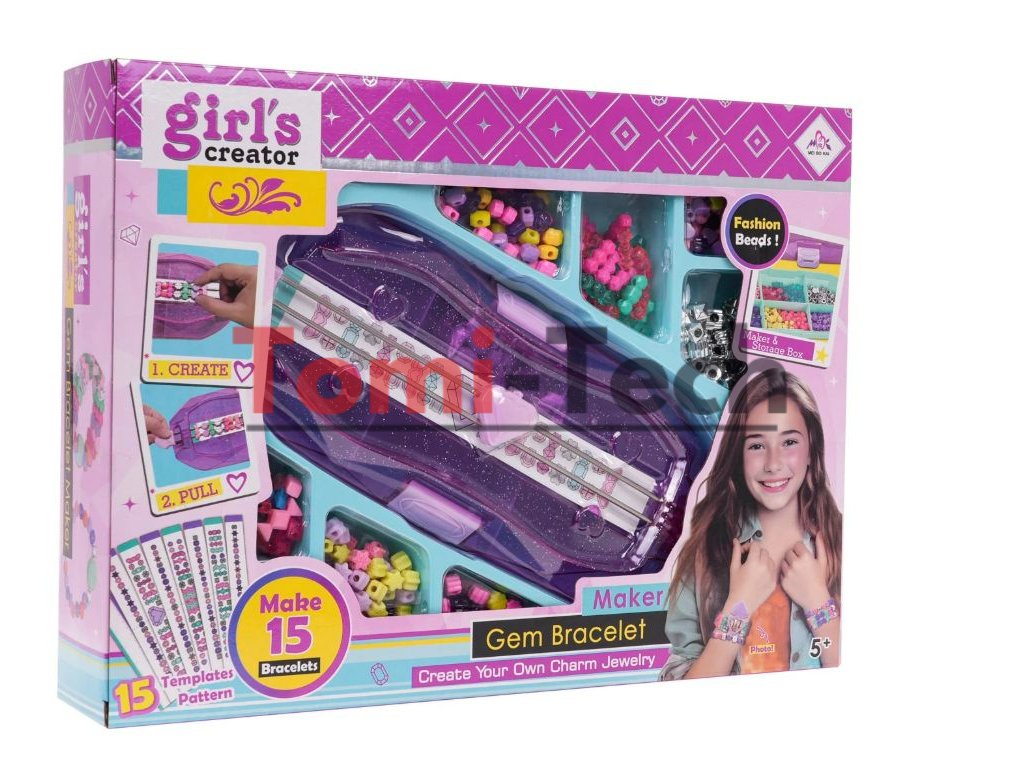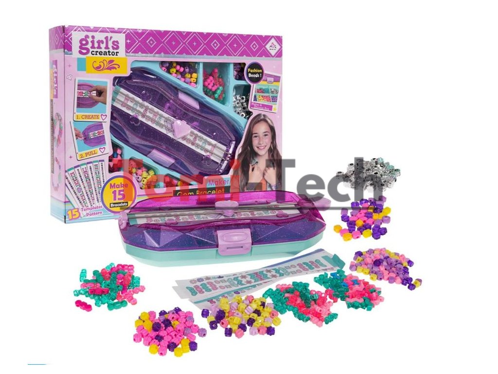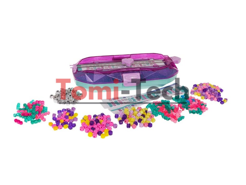 Kreatívna sada na výrobu náramkov pre deti od 5 rokov. S touto sadou si vaše dieťatko vytvorí vlastné originálne náramky. Súprava obsahuje viac ako 400 farebných korálok a 15 návrhov náramkov. Súčasťou je aj náramkovač s krabičkou na príslušenstvo. Výroba vlastného náramku je veľmi jednoduchá. Na dve tyčinky navlečiete vlasec, potom naň umiestnite korálky a potom vytiahnite vlákno s navlečenými korálkami zo strojčeka. Náramok môžeme vytvoriť podľa vzorov alebo podľa vlastných nápadov.