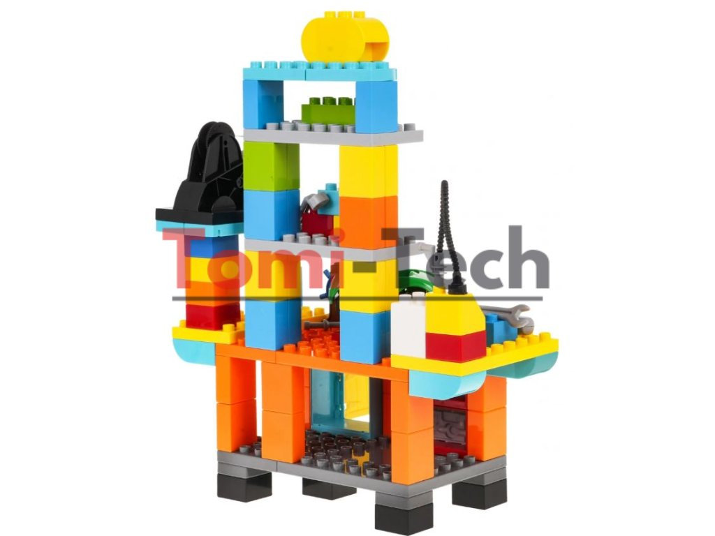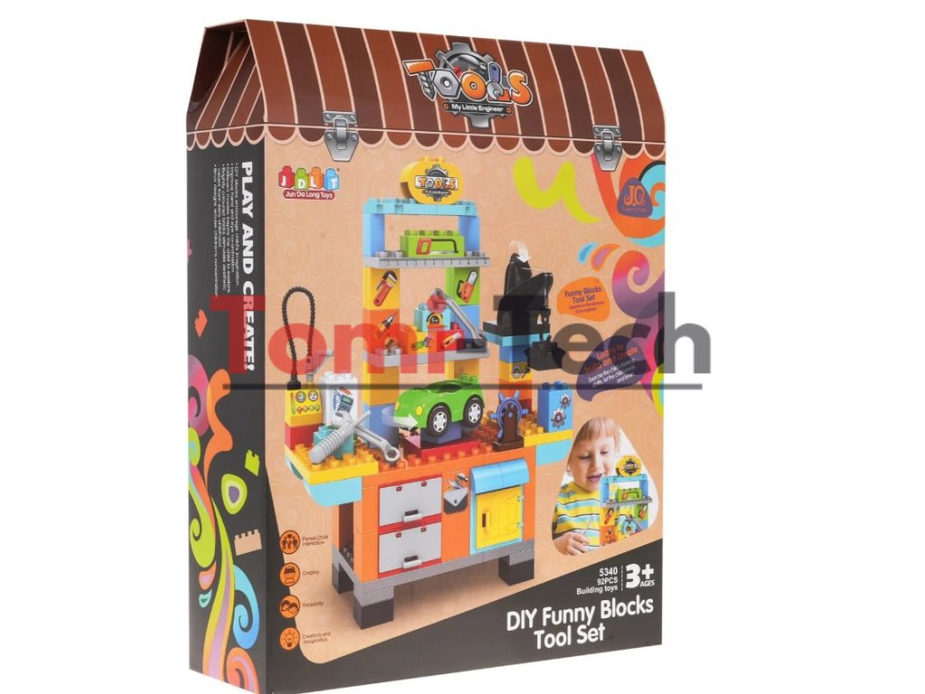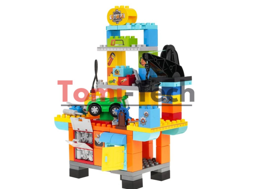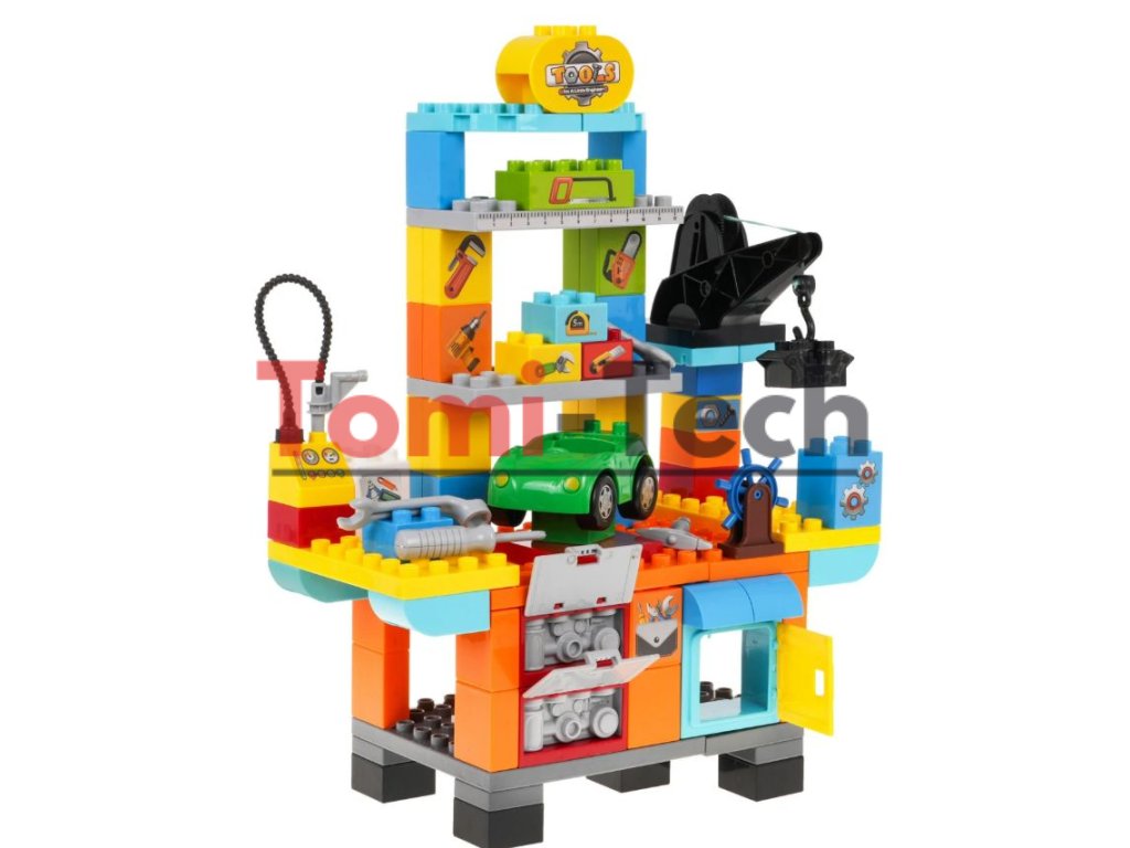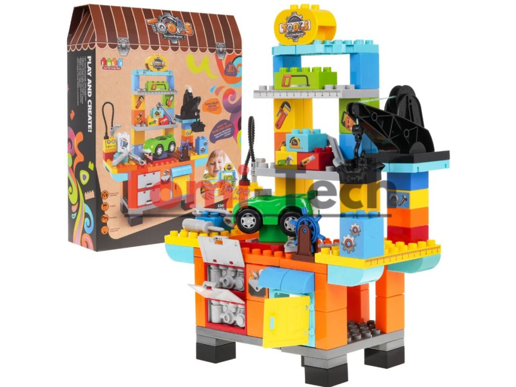 Sada stavebných kociek na stavbu dielne pre deti od 3 rokov . Kocky sú vyrobené z najkvalitnejších materiálov, sú pre dieťa bezpečné. Dielňa je vybavená jedným autíčkom, náradím - skrutkovačom, kľúčom, zdvihákom a dokonca aj strojčekom s pištoľou na pumpovanie vzduchu do kolies. Celá sada sa skladá z 92 dielikov .
