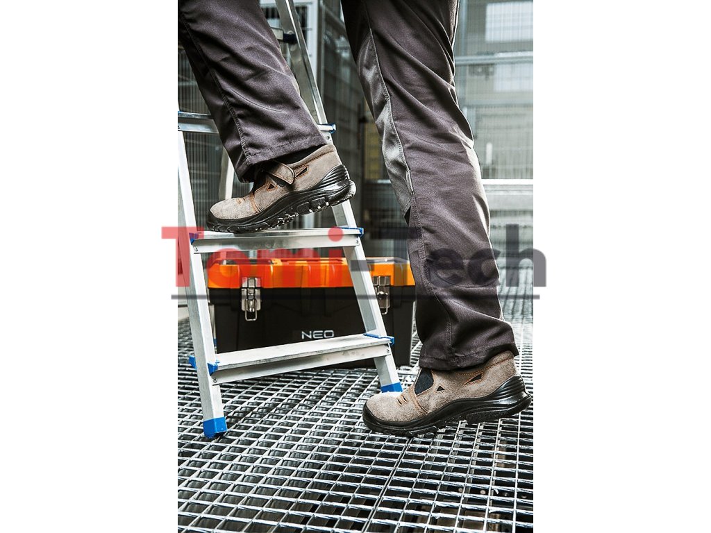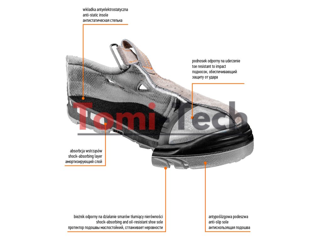 Pracovné sandále, semišové, protišmyková podrážka s tlmiacim systémom, odolné voči oderu, olejom, benzínu a iným organickým rozpúšťadlám, oceľová špička odoláva nárazu do 200 J, antistatická stielka, topánka vyrobená v kategórii S1 SRC (SRC - odolnosť proti pošmyknutiu na keramickom povrchu pokrytom roztokom laurylsulfátu sodného (SLS) a na oceľovom povrchu pokrytom glycerolom), certifikát CEDodatočné parametre