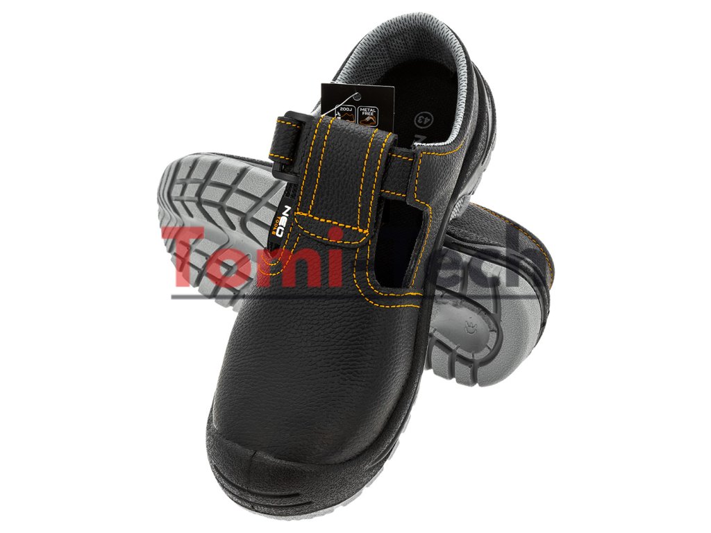 Kožené pracovné sandále, S1 SRC, obuv vyrobená v kategórii S1 SRC (SRC - odolnosť proti pošmyknutiu na keramickom povrchu potiahnutom roztokom laurylsulfátu sodného (SLS) a na oceľovom povrchu potiahnutom glycerolom), bez kovových prvkov, protišmyková podrážka s tlmiacim systémom, odolná voči oderu, olejom, benzínu a iným organickým rozpúšťadlám, uzavretá päta, antistatická stielka, veľkosť 42Dodatočné parametre
