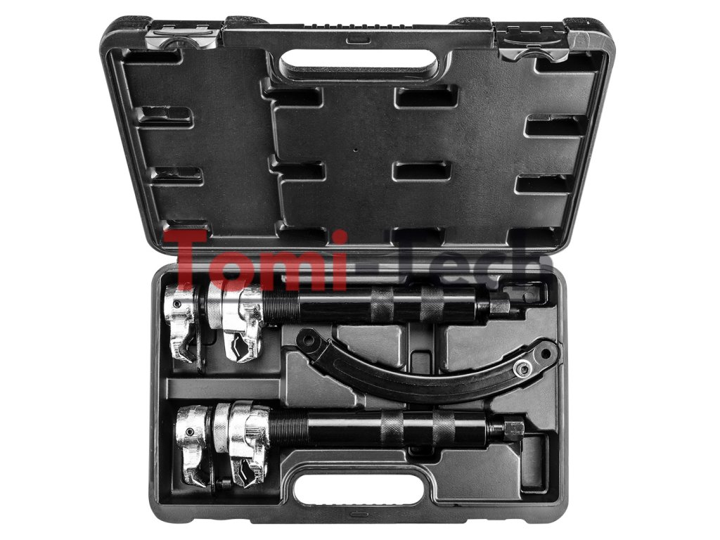 Pružinový stláčač, rozsah 23 – 280 mm, maximálne zaťaženie – 1 200 kg na pár, šesťhranný pohon s 19 mm kľúčom/nástrčkou, nastaviteľná bezpečnostná poistka proti náhodnému uvoľneniu pružiny.Dodatočné parametre
