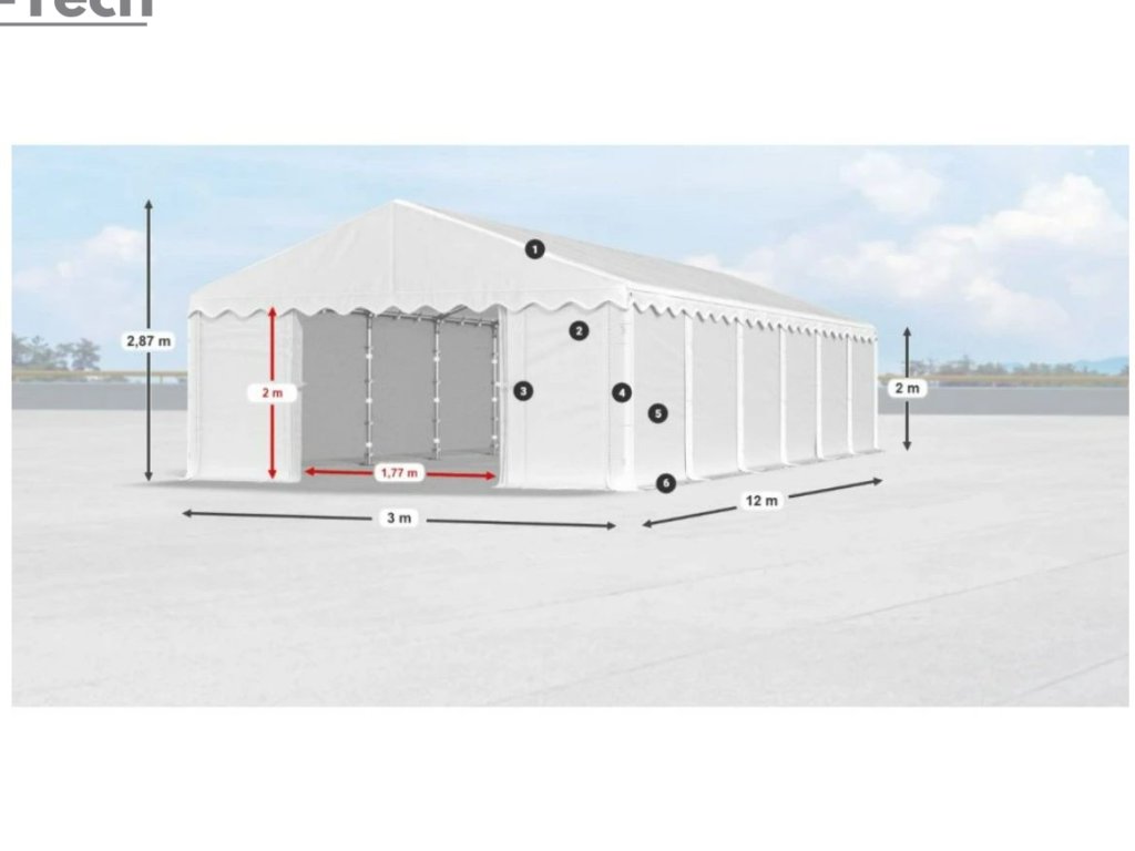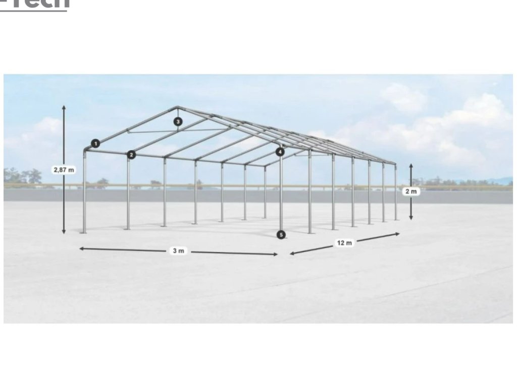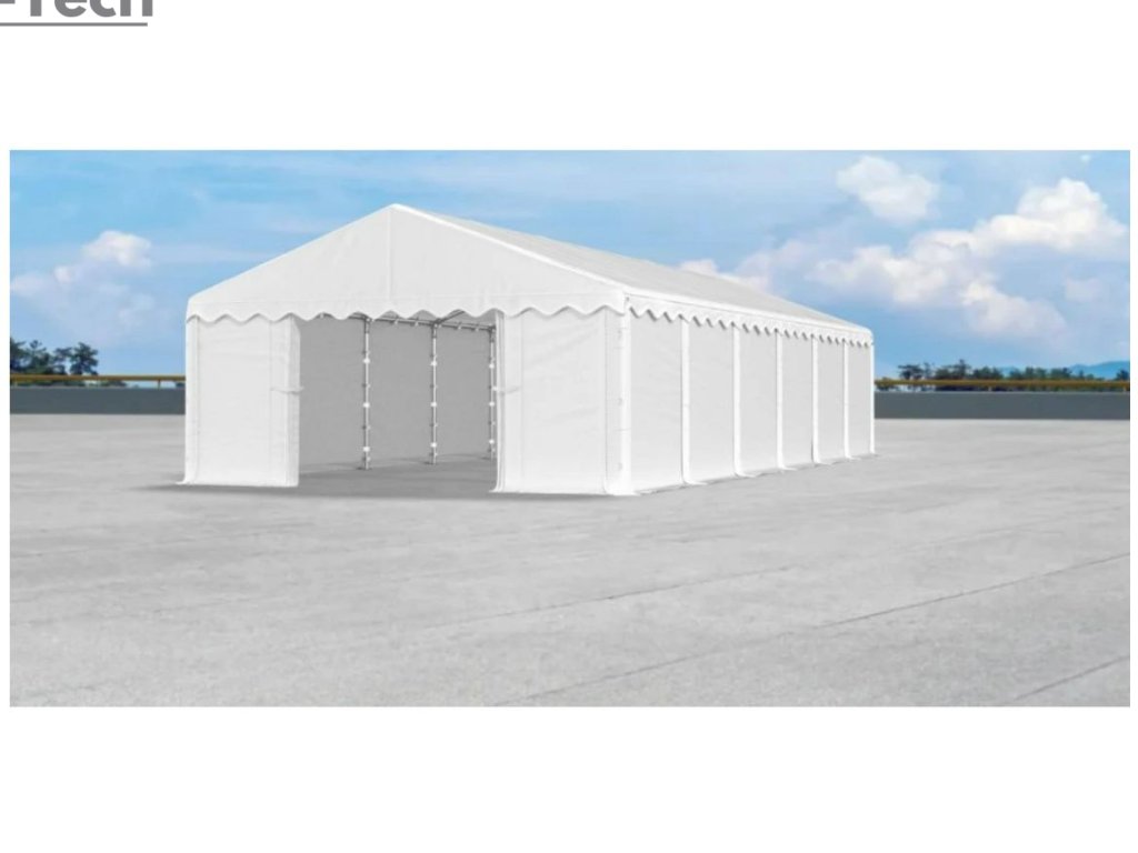 Skladová hala/garáž 3x12m s výškou boku 2m s pevnou oceľovou konštrukciou a stanom z kvalitného polyetylénu. Hrubá oceľová konštrukcia zabezpečuje odolnosť proti poveternostným podmienkam, stan je vyrobený z ľahkého materiálu, ktorý je veľmi odolný voči UV žiareniu, vode a plesniam. Jednou z hlavných výhod skladovej haly/garáže je veľký priestor, ktorý poskytuje. Bez ohľadu na to, či potrebujete skladovať záhradné náradie, stavebný materiál, vozidlá alebo iné predmety, skladová hala/garáž vám ponúka dostatočný priestor pre vaše potreby. Skladová hala/garáž tiež poskytuje ochranu pred nepriaznivými poveternostnými podmienkami. Je vyrobená z kvalitných a odolných materiálov, ktoré sú odolné voči dažďu, vetru, snehu a iným poveternostným vplyvom.