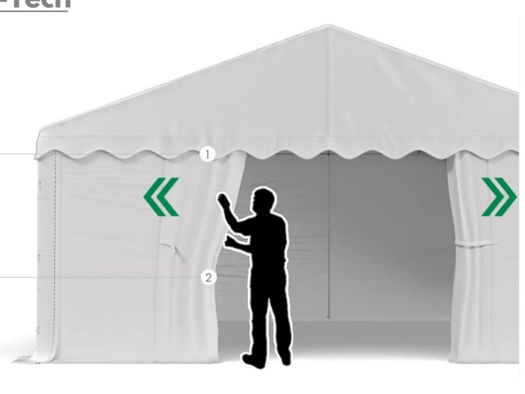 - Celú šírku vchodu ľahko získate odopnutím celej prednej plachty.