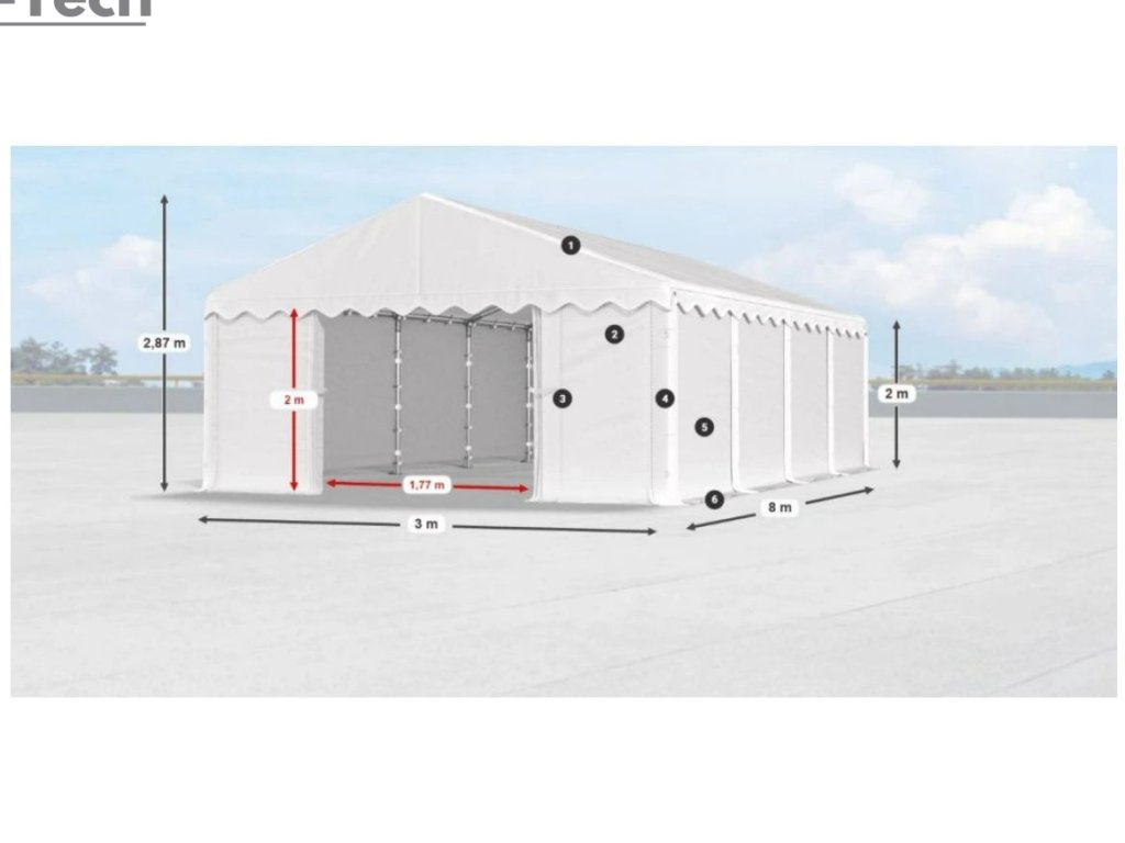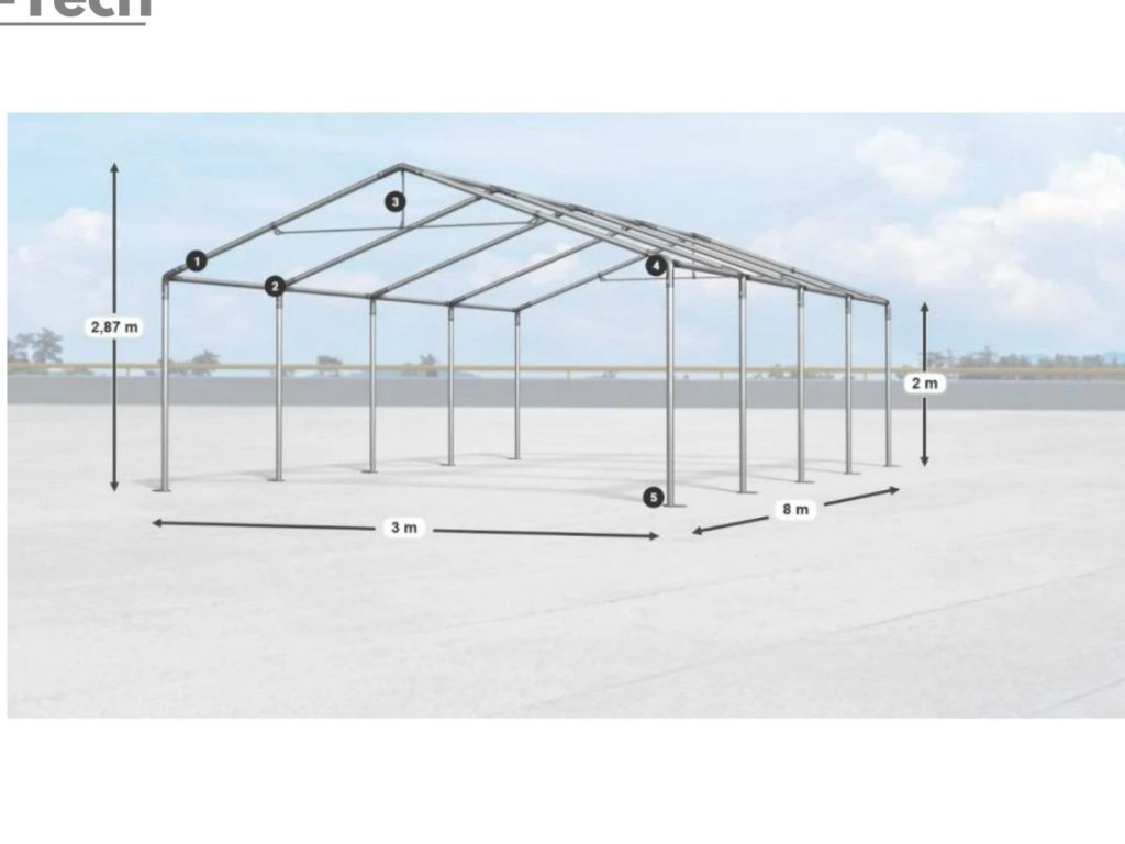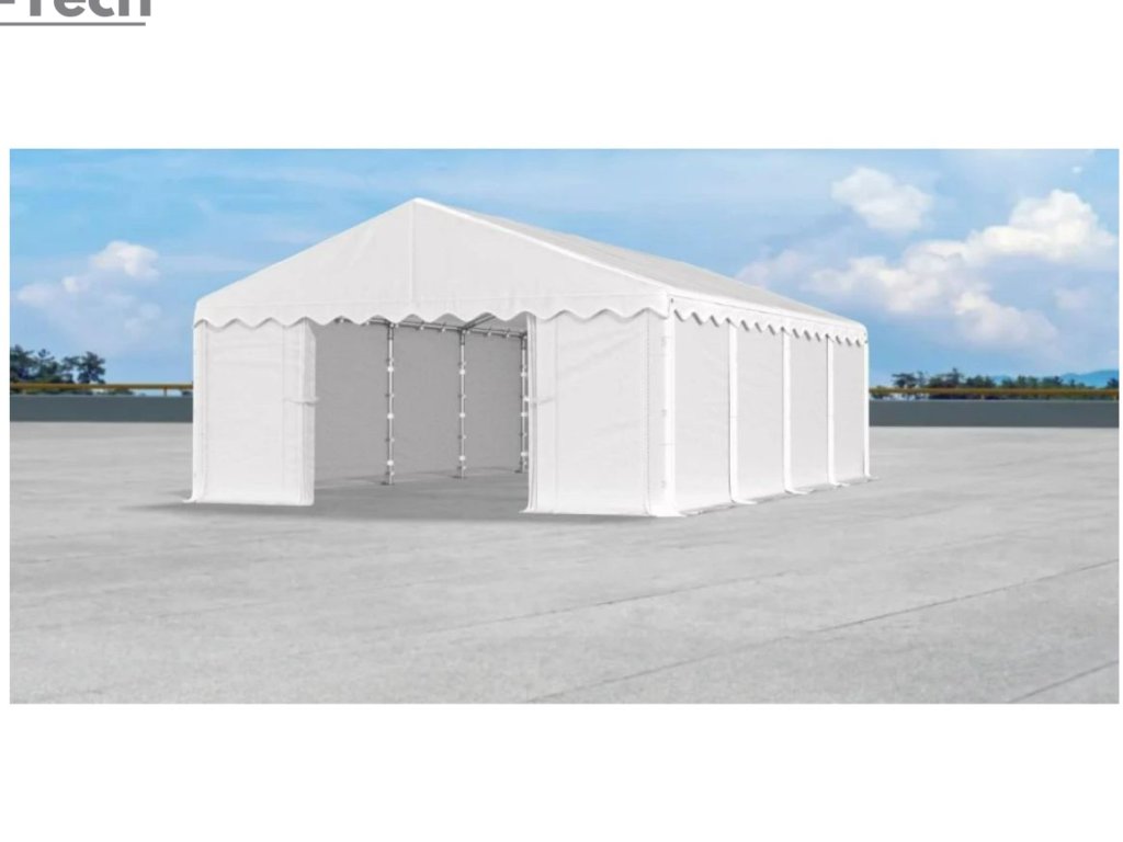 Skladová hala/garáž 3x8m s výškou boku 2m s pevnou oceľovou konštrukciou a stanom z kvalitného polyetylénu. Hrubá oceľová konštrukcia zabezpečuje odolnosť proti poveternostným podmienkam, stan je vyrobený z ľahkého materiálu, ktorý je veľmi odolný voči UV žiareniu, vode a plesniam. Jednou z hlavných výhod skladovej haly/garáže je veľký priestor, ktorý poskytuje. Bez ohľadu na to, či potrebujete skladovať záhradné náradie, stavebný materiál, vozidlá alebo iné predmety, skladová hala/garáž vám ponúka dostatočný priestor pre vaše potreby. Skladová hala/garáž tiež poskytuje ochranu pred nepriaznivými poveternostnými podmienkami. Je vyrobená z kvalitných a odolných materiálov, ktoré sú odolné voči dažďu, vetru, snehu a iným poveternostným vplyvom.