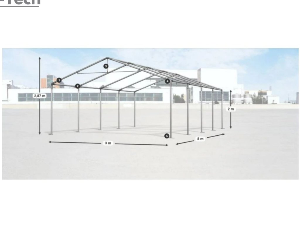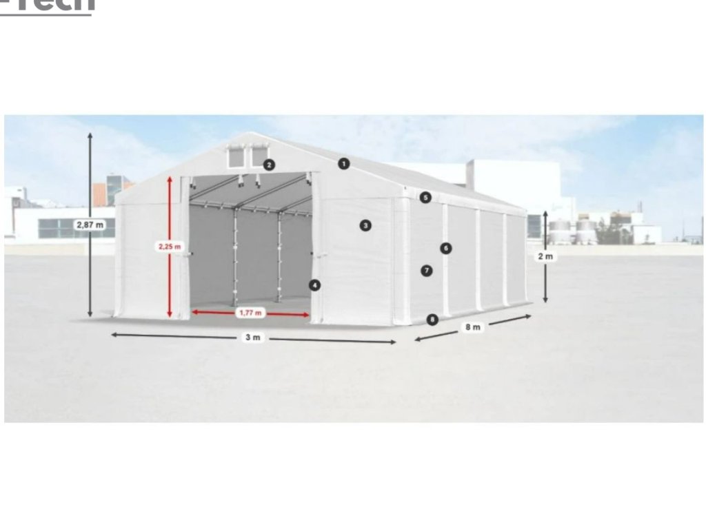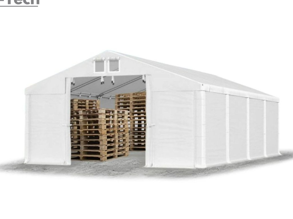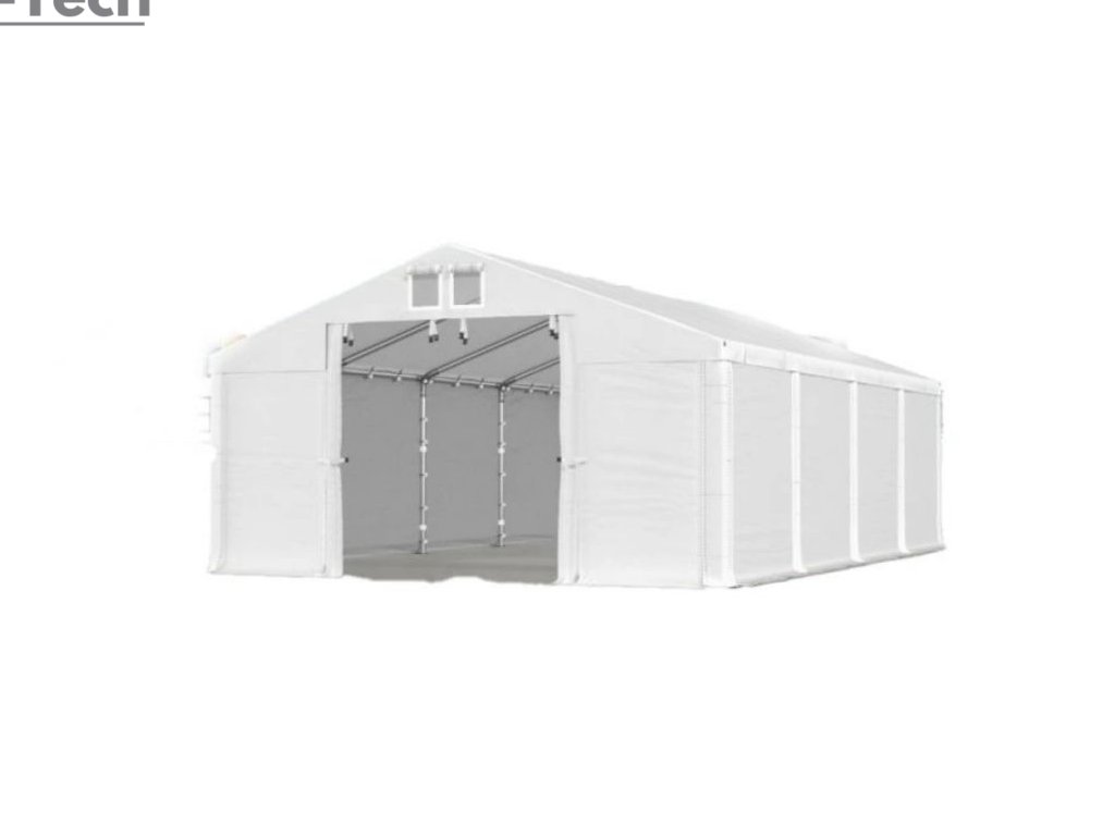 Skladová hala/garáž 3x8m s výškou boku 2m s pevnou oceľovou konštrukciou a stanom z kvalitného PVC (polyvinylchlorid) 560g/m2. Hrubá oceľová konštrukcia zabezpečuje odolnosť proti poveternostným podmienkam, stan je vyrobený z ľahkého materiálu, ktorý je veľmi odolný voči UV žiareniu, vode a plesniam. Jednou z hlavných výhod skladovej haly/garáže je veľký priestor, ktorý poskytuje. Bez ohľadu na to, či potrebujete skladovať záhradné náradie, stavebný materiál, vozidlá alebo iné predmety, skladová hala/garáž vám ponúka dostatočný priestor pre vaše potreby. Skladová hala/garáž tiež poskytuje ochranu pred nepriaznivými poveternostnými podmienkami. Je vyrobená z kvalitných a odolných materiálov, ktoré sú odolné voči dažďu, vetru, snehu a iným poveternostným vplyvom.