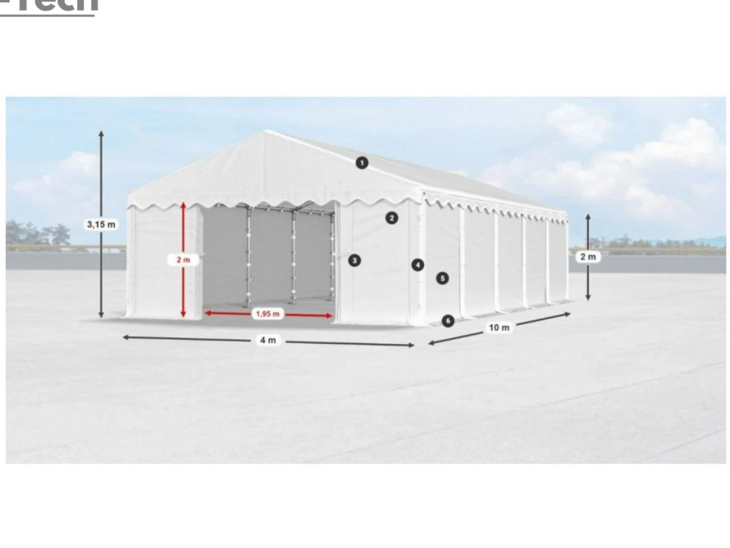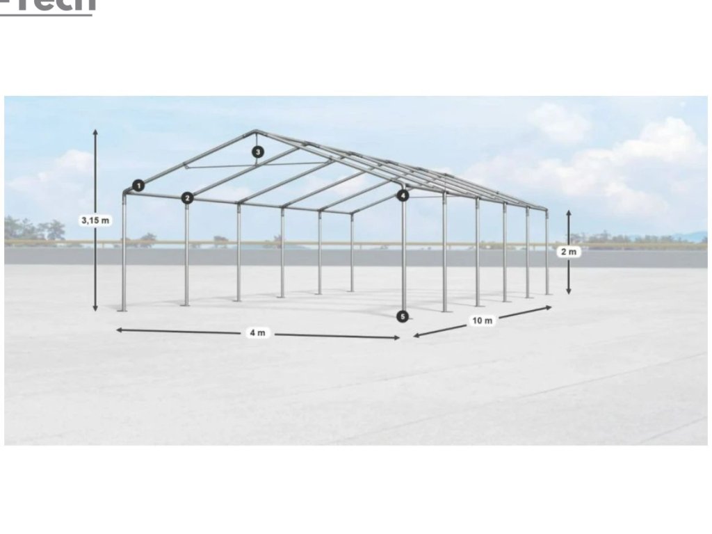 Skladová hala/garáž 4x10m s výškou boku 2m s pevnou oceľovou konštrukciou a stanom z kvalitného polyetylénu. Hrubá oceľová konštrukcia zabezpečuje odolnosť proti poveternostným podmienkam, stan je vyrobený z ľahkého materiálu, ktorý je veľmi odolný voči UV žiareniu, vode a plesniam. Jednou z hlavných výhod skladovej haly/garáže je veľký priestor, ktorý poskytuje. Bez ohľadu na to, či potrebujete skladovať záhradné náradie, stavebný materiál, vozidlá alebo iné predmety, skladová hala/garáž vám ponúka dostatočný priestor pre vaše potreby. Skladová hala/garáž tiež poskytuje ochranu pred nepriaznivými poveternostnými podmienkami. Je vyrobená z kvalitných a odolných materiálov, ktoré sú odolné voči dažďu, vetru, snehu a iným poveternostným vplyvom.