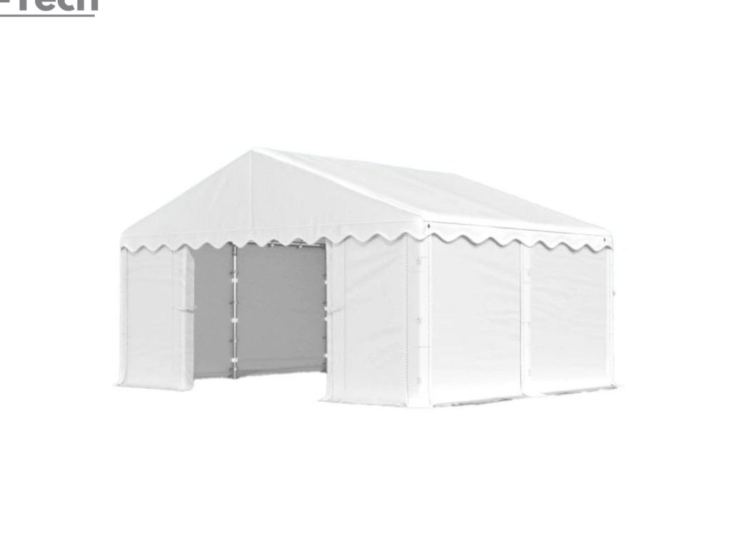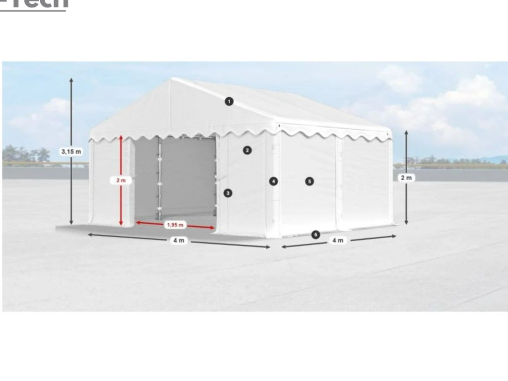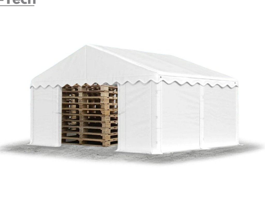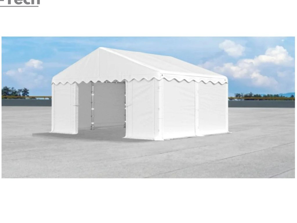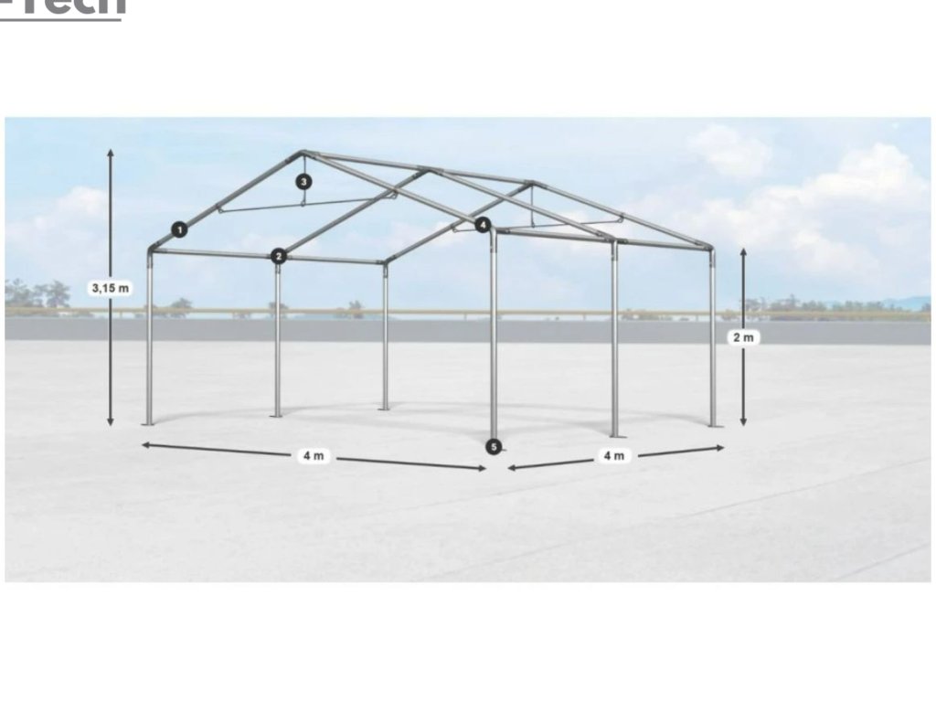 Skladová hala/garáž 4x4m s výškou boku 2m s pevnou oceľovou konštrukciou a stanom z kvalitného polyetylénu. Hrubá oceľová konštrukcia zabezpečuje odolnosť proti poveternostným podmienkam, stan je vyrobený z ľahkého materiálu, ktorý je veľmi odolný voči UV žiareniu, vode a plesniam. Jednou z hlavných výhod skladovej haly/garáže je veľký priestor, ktorý poskytuje. Bez ohľadu na to, či potrebujete skladovať záhradné náradie, stavebný materiál, vozidlá alebo iné predmety, skladová hala/garáž vám ponúka dostatočný priestor pre vaše potreby. Skladová hala/garáž tiež poskytuje ochranu pred nepriaznivými poveternostnými podmienkami. Je vyrobená z kvalitných a odolných materiálov, ktoré sú odolné voči dažďu, vetru, snehu a iným poveternostným vplyvom.