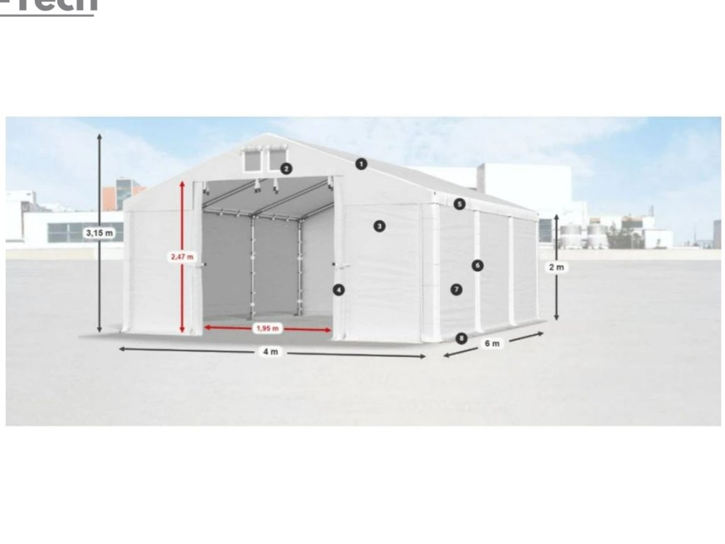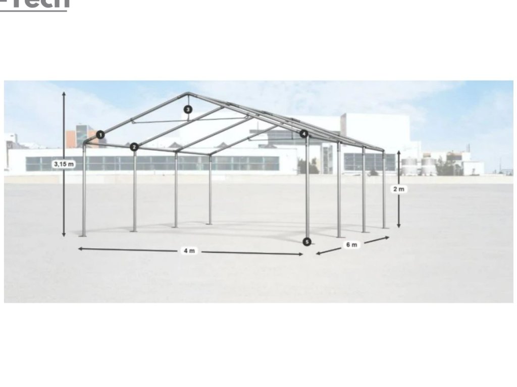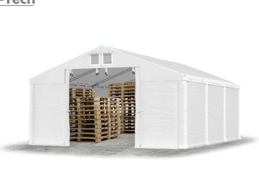 Skladová hala/garáž 4x6m s výškou boku 2m s pevnou oceľovou konštrukciou a stanom z kvalitného PVC (polyvinylchlorid) 560g/m2. Hrubá oceľová konštrukcia zabezpečuje odolnosť proti poveternostným podmienkam, stan je vyrobený z ľahkého materiálu, ktorý je veľmi odolný voči UV žiareniu, vode a plesniam. Jednou z hlavných výhod skladovej haly/garáže je veľký priestor, ktorý poskytuje. Bez ohľadu na to, či potrebujete skladovať záhradné náradie, stavebný materiál, vozidlá alebo iné predmety, skladová hala/garáž vám ponúka dostatočný priestor pre vaše potreby. Skladová hala/garáž tiež poskytuje ochranu pred nepriaznivými poveternostnými podmienkami. Je vyrobená z kvalitných a odolných materiálov, ktoré sú odolné voči dažďu, vetru, snehu a iným poveternostným vplyvom.