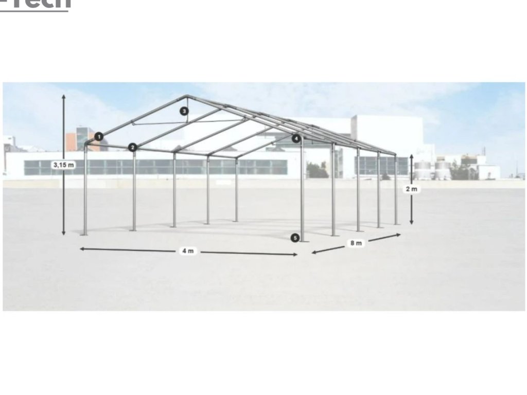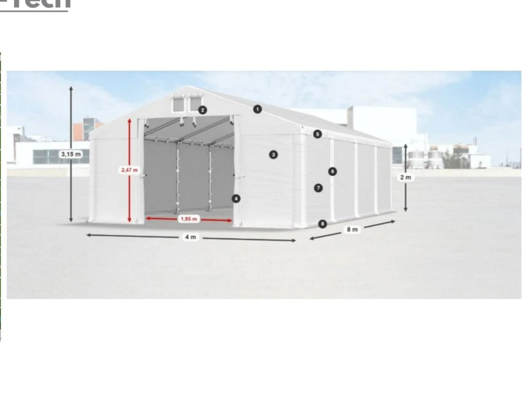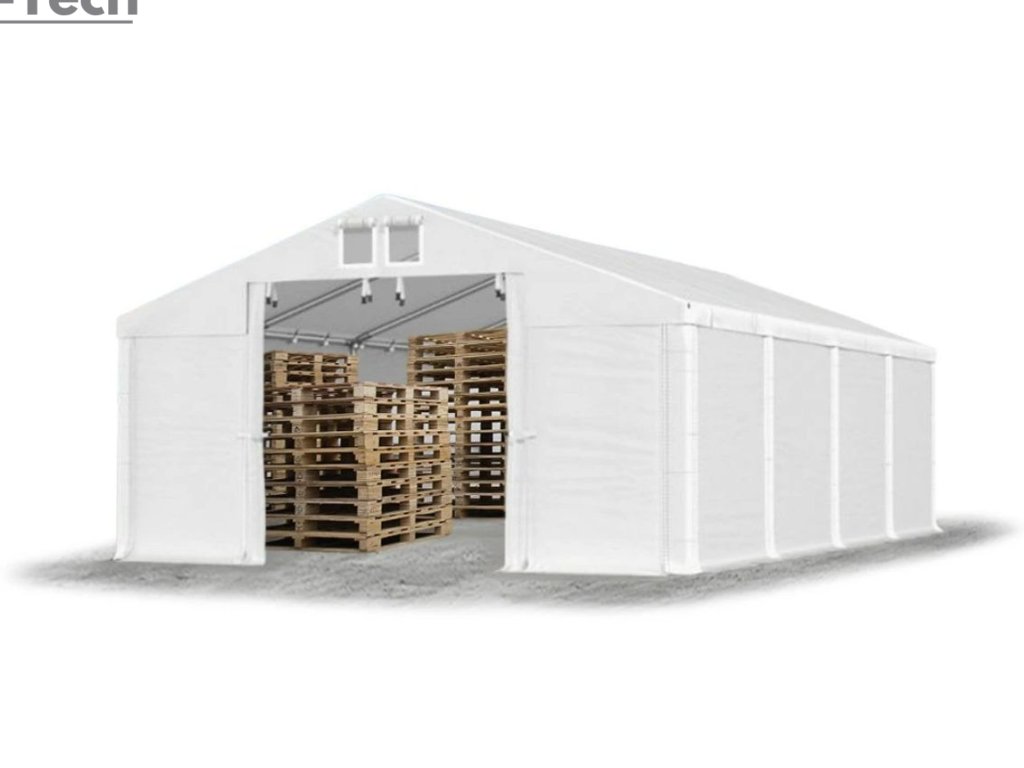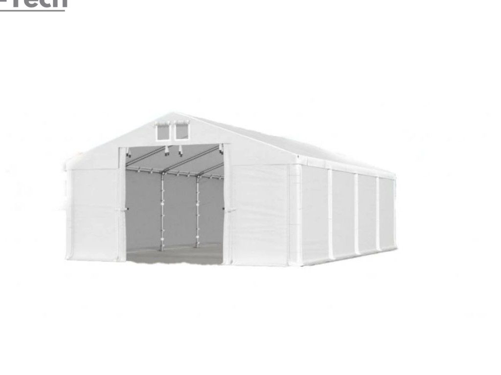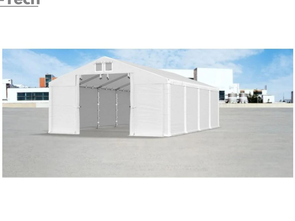 Skladová hala/garáž 4x8m s výškou boku 2m s pevnou oceľovou konštrukciou a stanom z kvalitného PVC (polyvinylchlorid) 560g/m2. Hrubá oceľová konštrukcia zabezpečuje odolnosť proti poveternostným podmienkam, stan je vyrobený z ľahkého materiálu, ktorý je veľmi odolný voči UV žiareniu, vode a plesniam. Jednou z hlavných výhod skladovej haly/garáže je veľký priestor, ktorý poskytuje. Bez ohľadu na to, či potrebujete skladovať záhradné náradie, stavebný materiál, vozidlá alebo iné predmety, skladová hala/garáž vám ponúka dostatočný priestor pre vaše potreby. Skladová hala/garáž tiež poskytuje ochranu pred nepriaznivými poveternostnými podmienkami. Je vyrobená z kvalitných a odolných materiálov, ktoré sú odolné voči dažďu, vetru, snehu a iným poveternostným vplyvom.