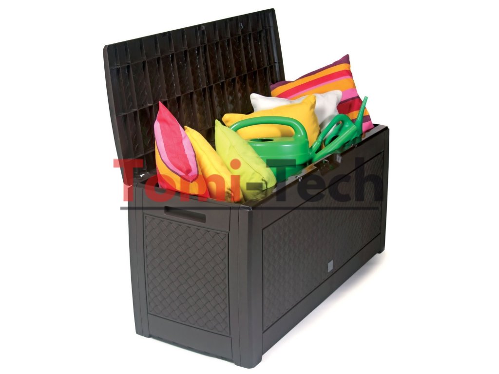 - Ľahká konštrukcia poskytuje dostatočné vetranie a ochranu pred náhlym dažďom pre rôzne predmety uložené vo vnútri - vankúše záhradného nábytku, deky, záhradné pomôcky, menší nábytok alebo detské hračky.