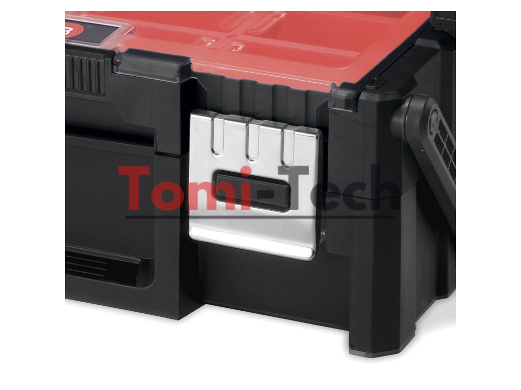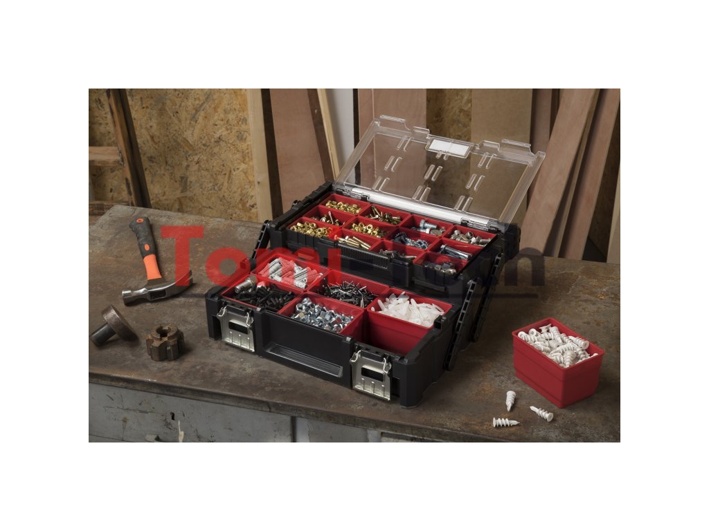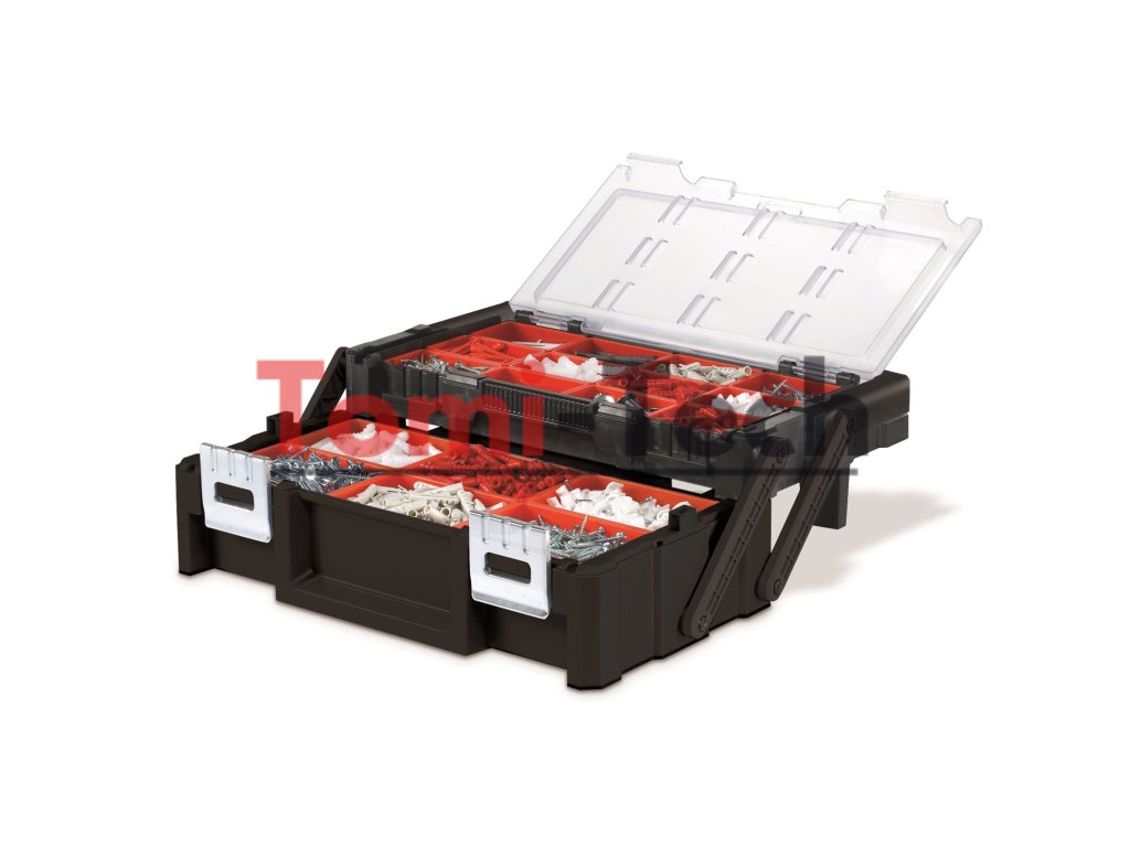 Praktická a priestranná skrinka na náradie je vybavená vymeniteľnými nádobami rôznych veľkostí: 6 hlbokých a 12 štandardných.