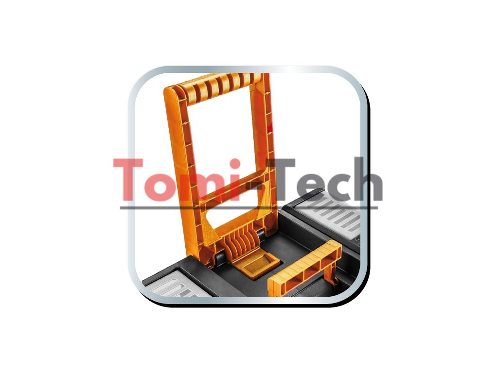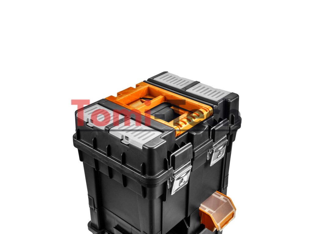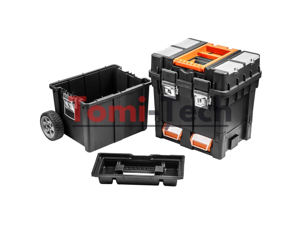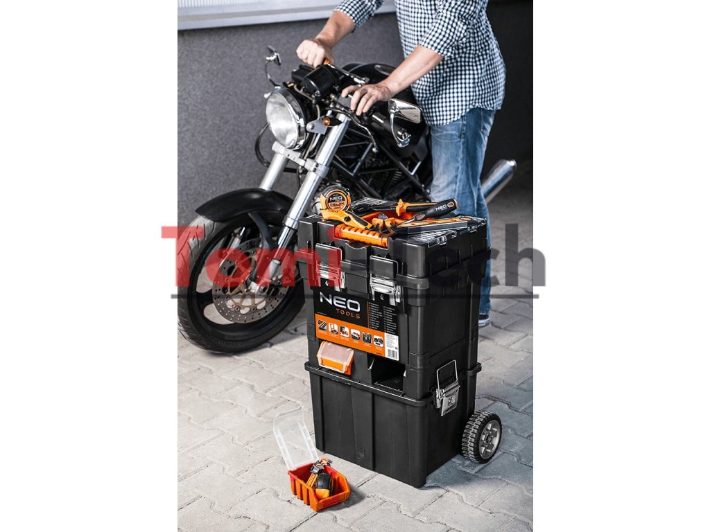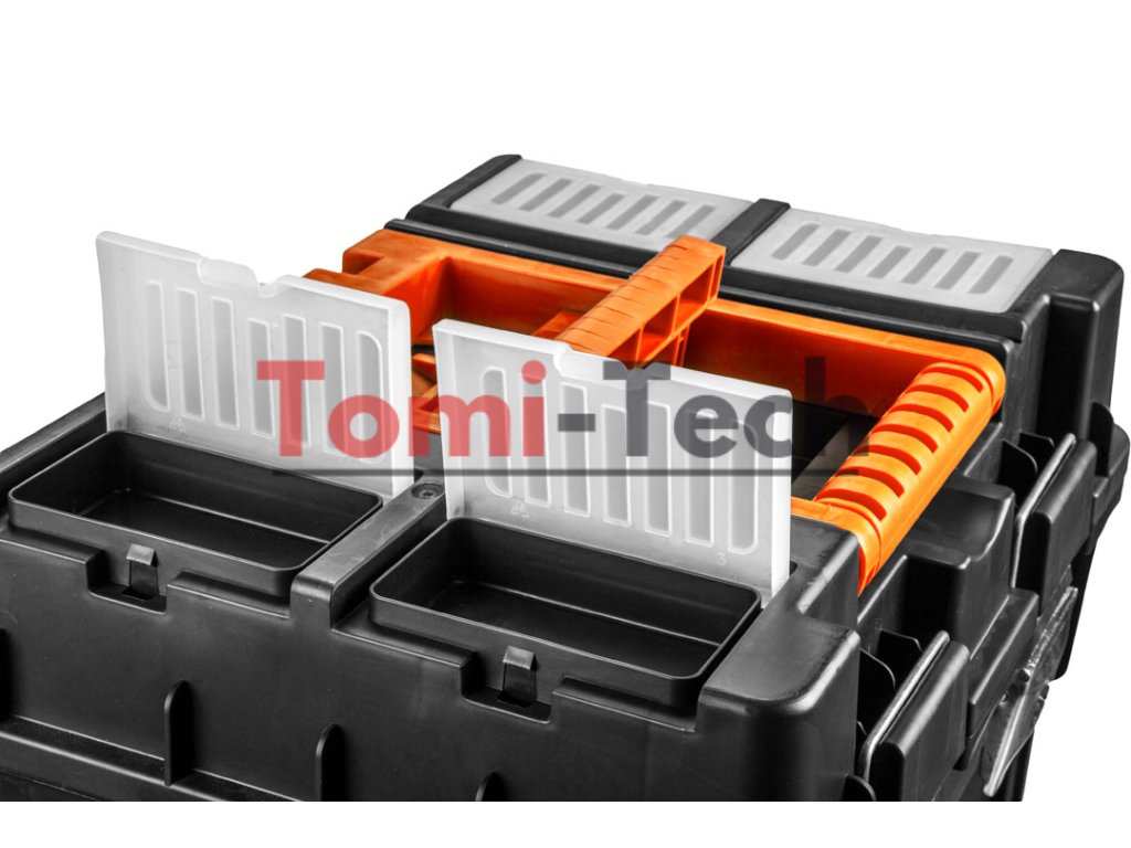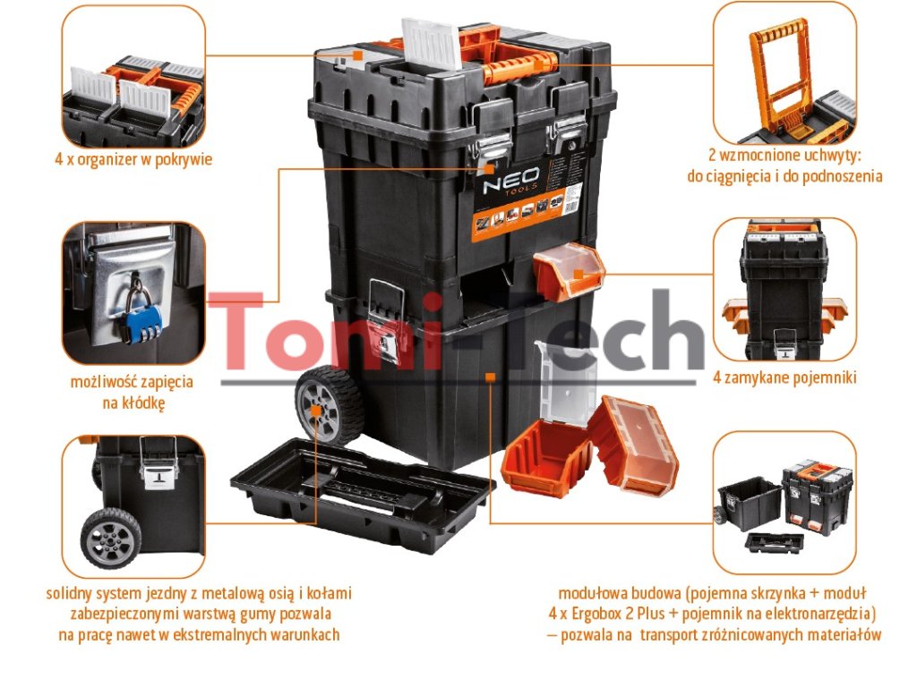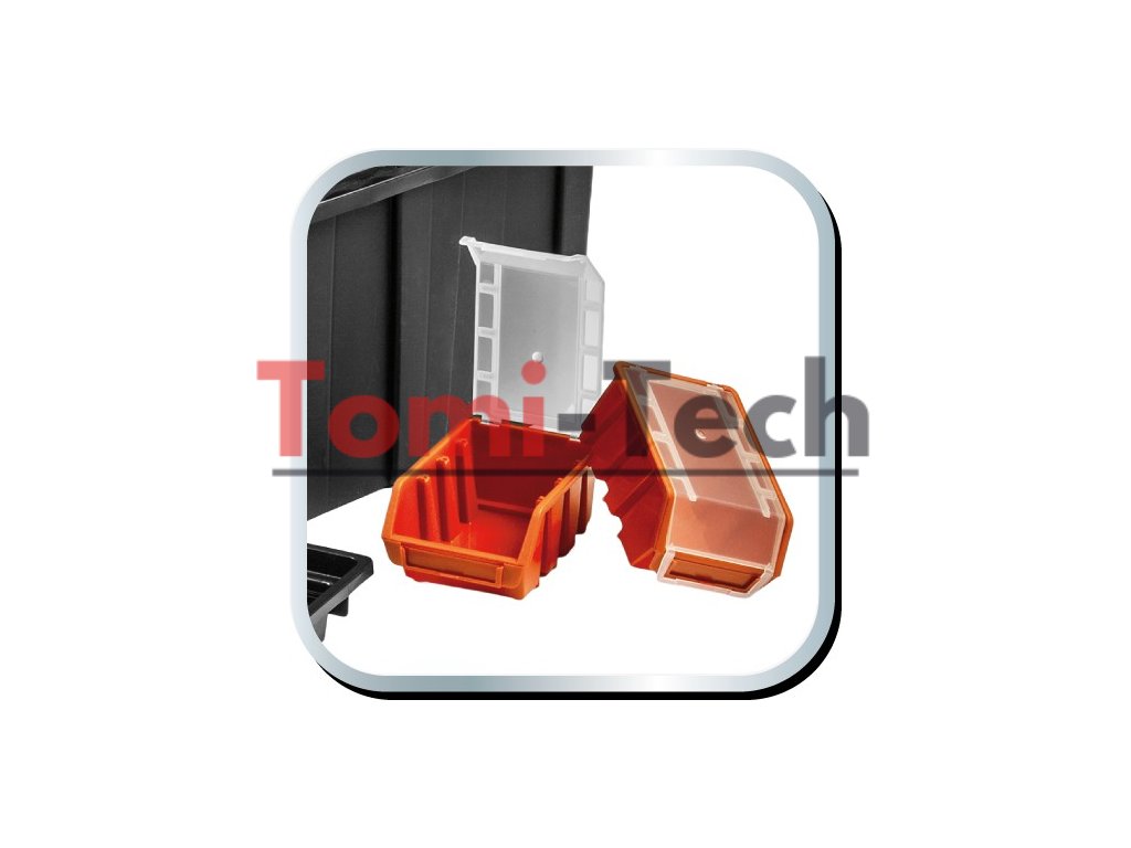 Mobilná dielňa, bedňa na náradie, štyri organizéry, štyri uzamykateľné ergoboxy, kovové západky, polohovacia drážka s krajčírskym metrom, dve plastové rukoväte, bočné rukoväte, dve kolieska, protišmykové rohy, nosnosť 40 kgDodatočné parametre