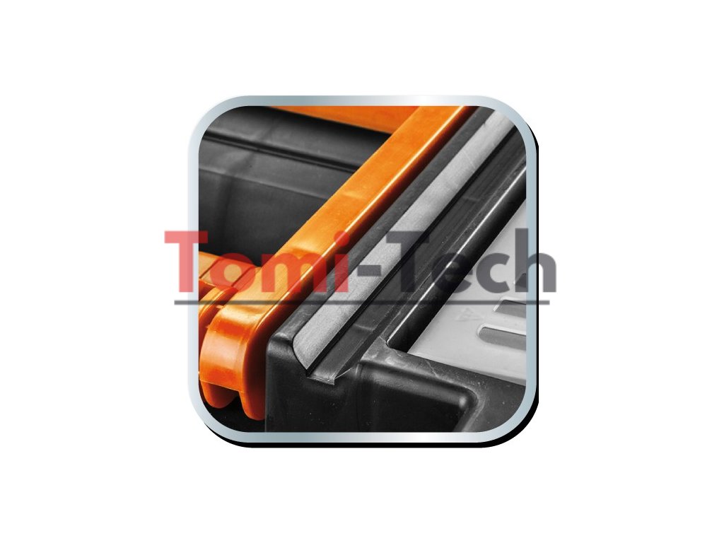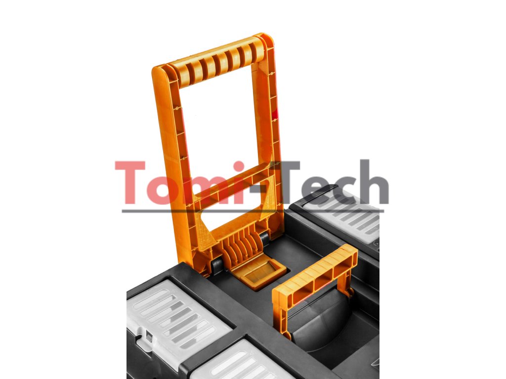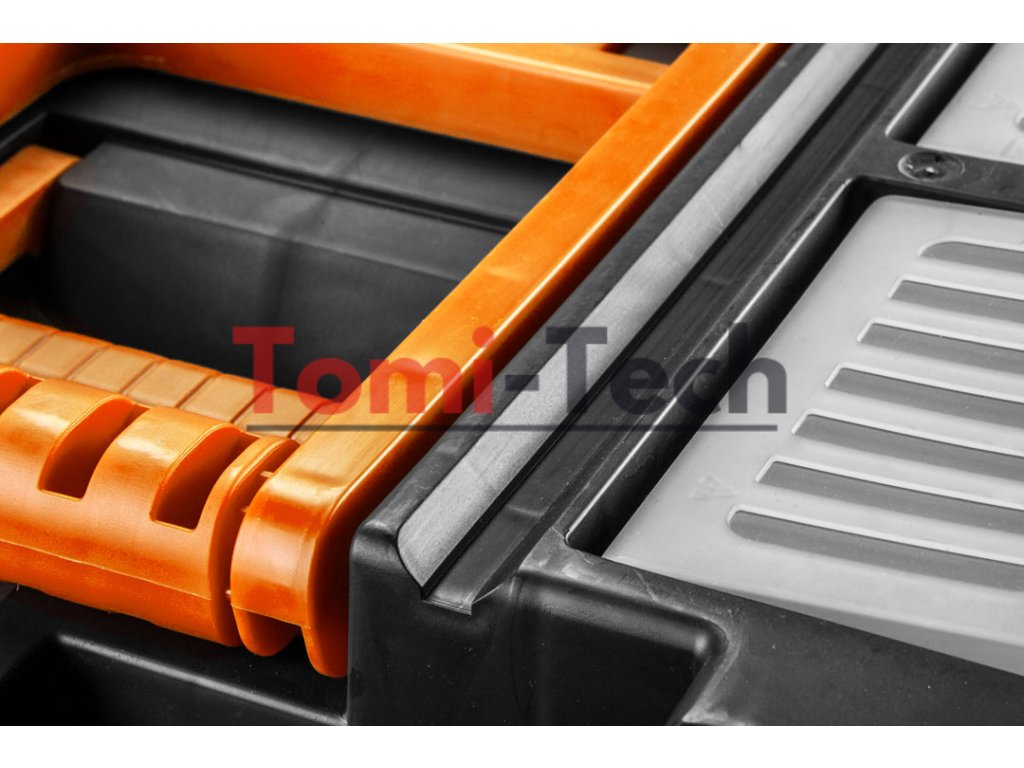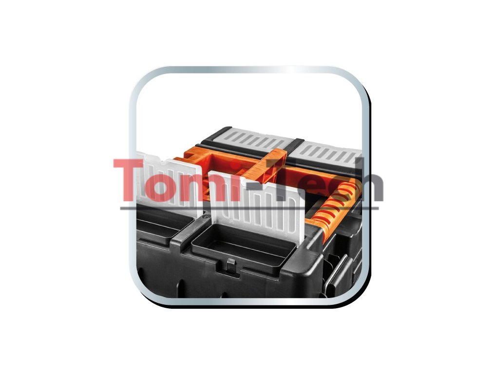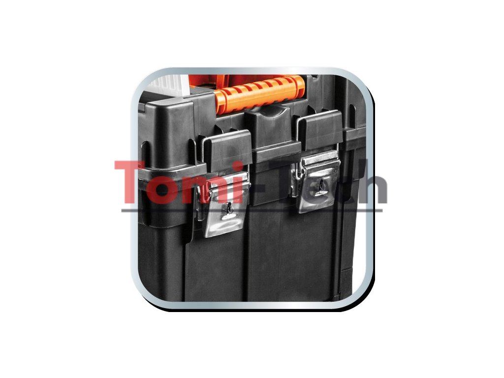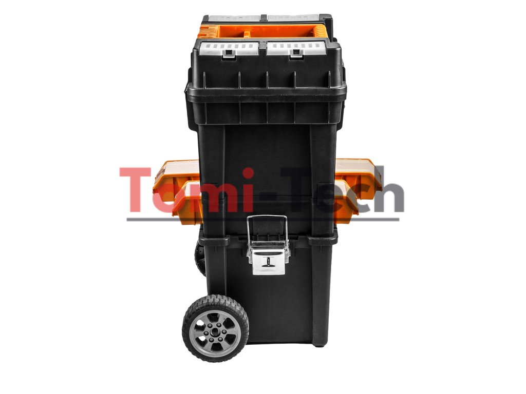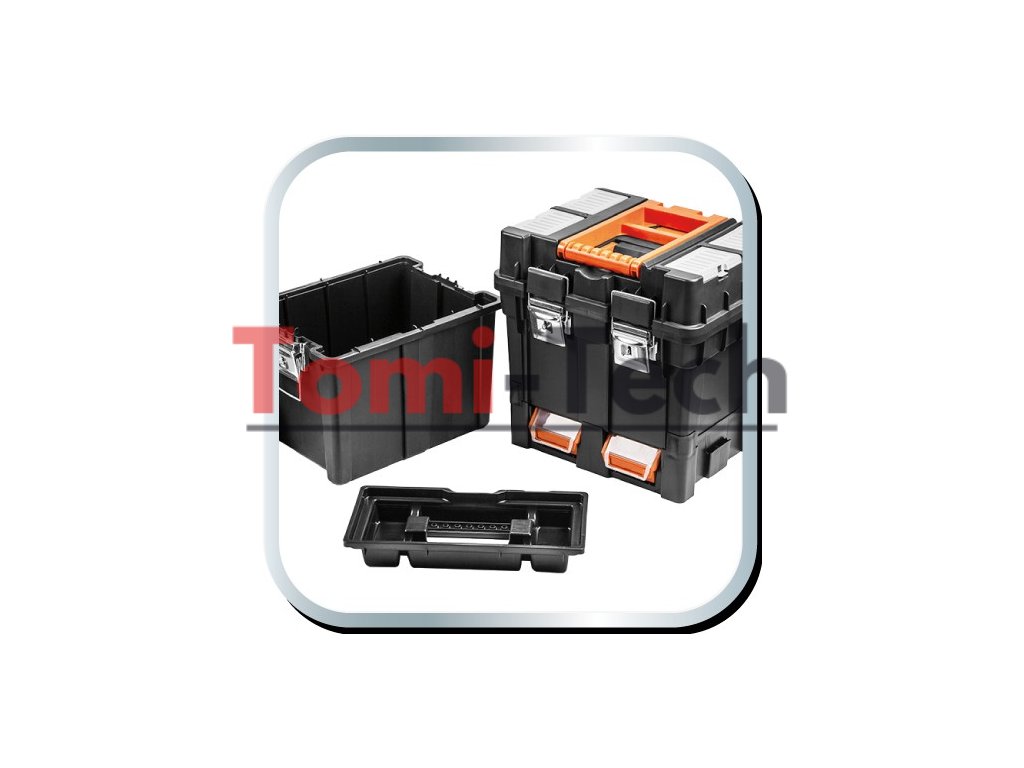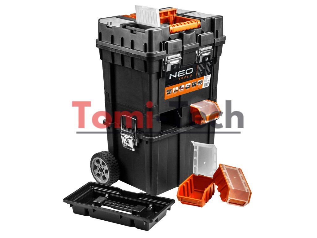 Mobilná dielňa, bedňa na náradie, štyri organizéry, štyri uzamykateľné ergoboxy, kovové západky, polohovacia drážka s krajčírskym metrom, dve plastové rukoväte, bočné rukoväte, dve kolieska, protišmykové rohy, nosnosť 40 kgDodatočné parametre
