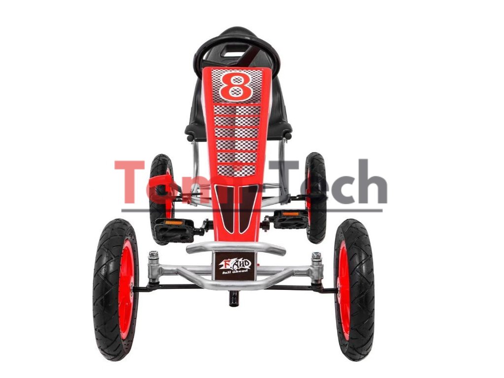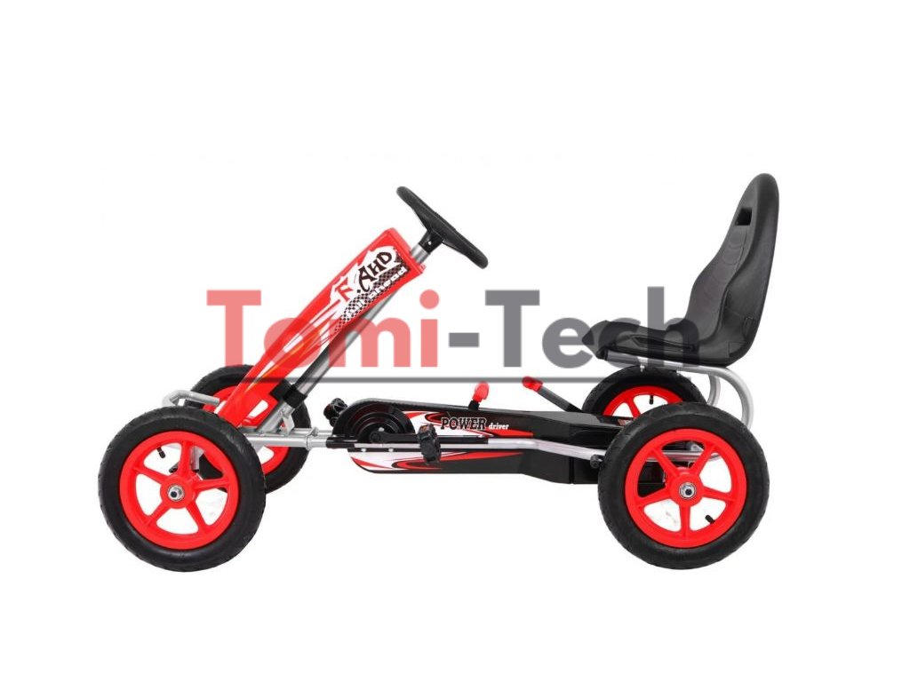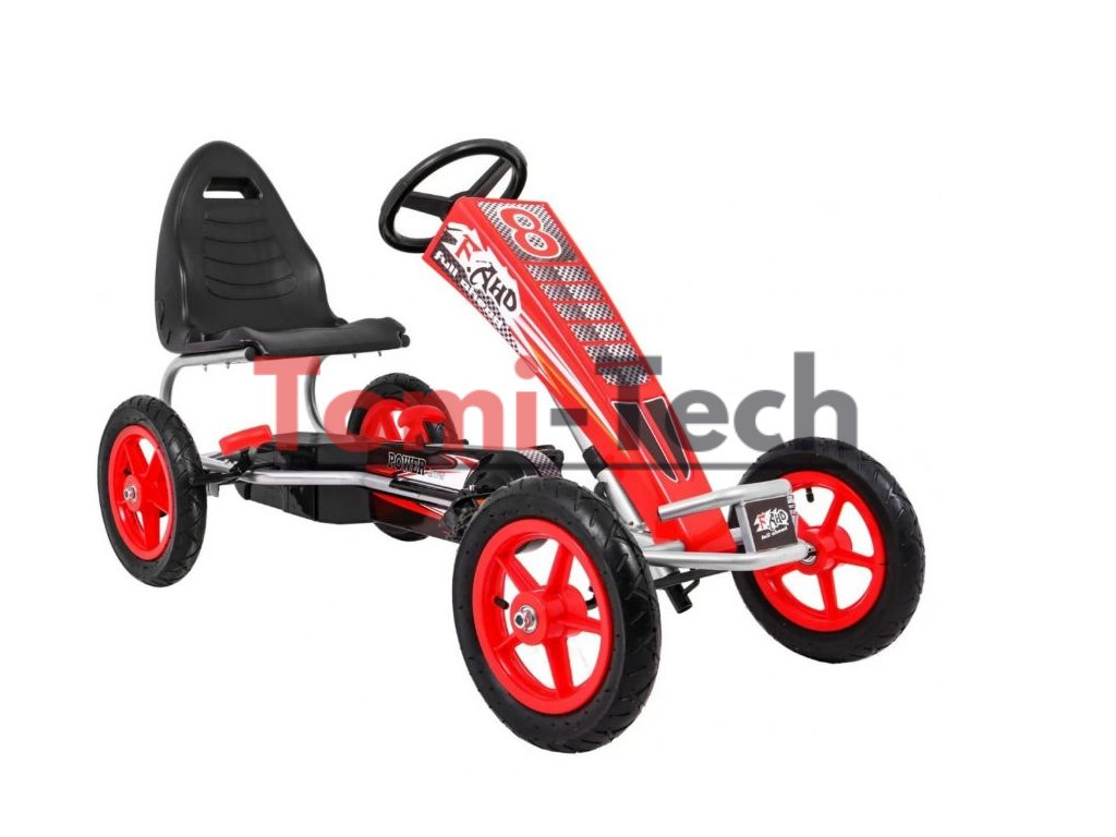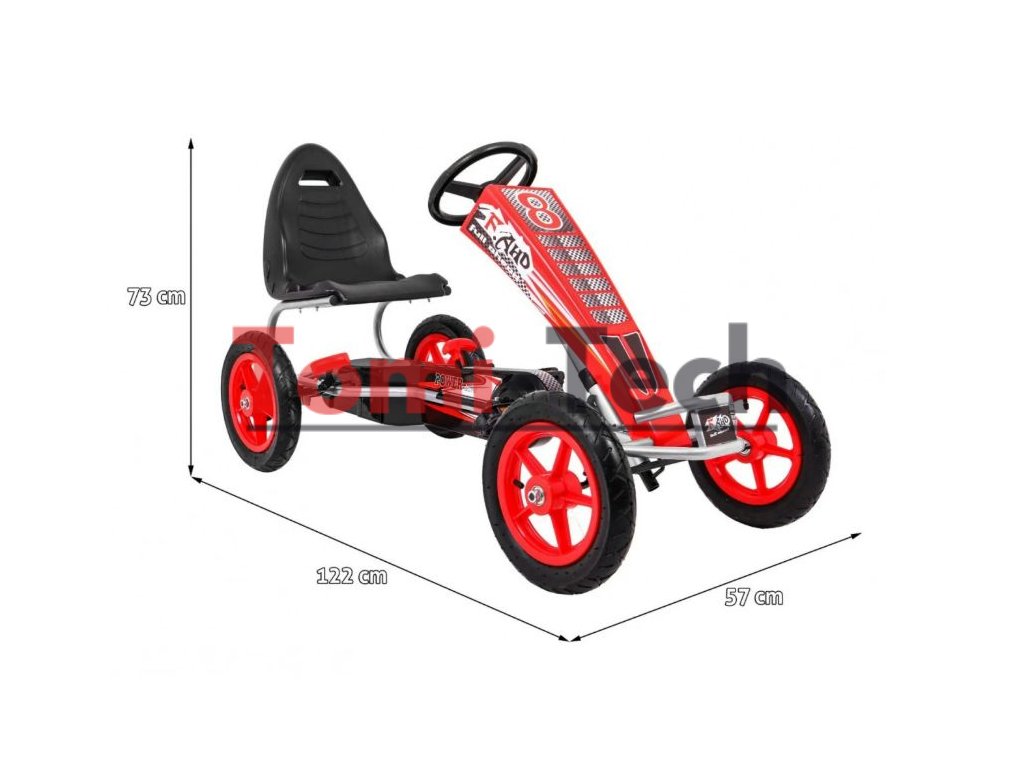 Detská šliapacia motokára s nafukovacími kolesami bola vyrobená z ľahkej kovovej konštrukcie s doplnkami z umelej hmoty. Je vybavená nafukovacími gumovými kolesami a pohodlným, tvarovaným sedákom, ktorý zaistí pohodlie pri jazde.Sedadlo má dvojstupňové nastavenie vzdialenosti od volantu, vďaka čomu sa ľahko prispôsobí výške dieťaťa. Ručná brzda zaistí bezpečné brzdenie.