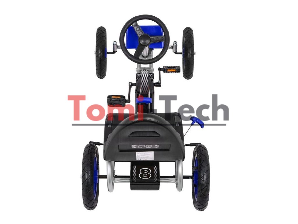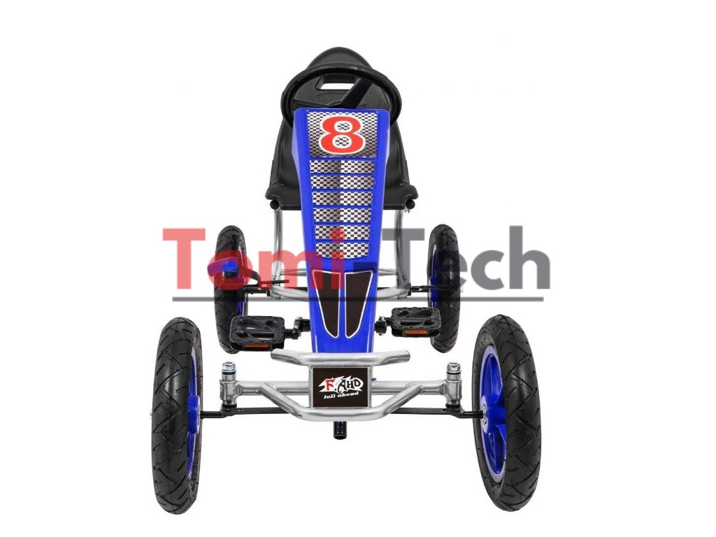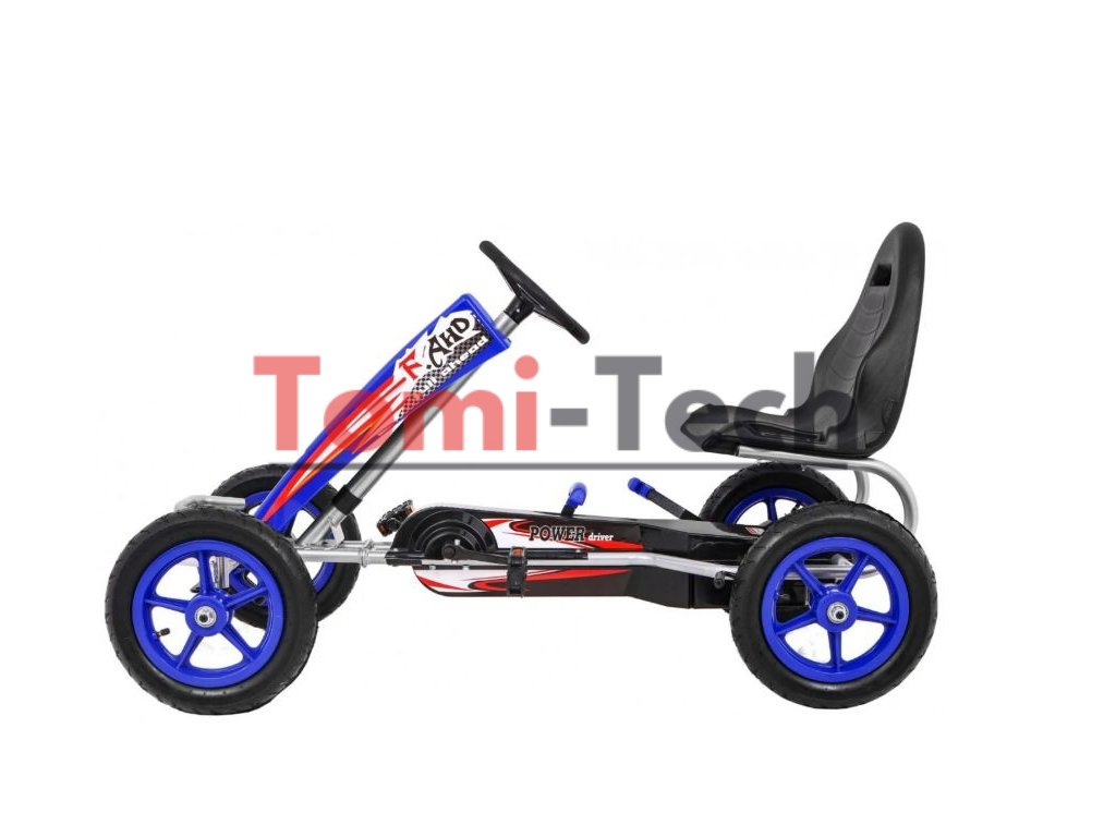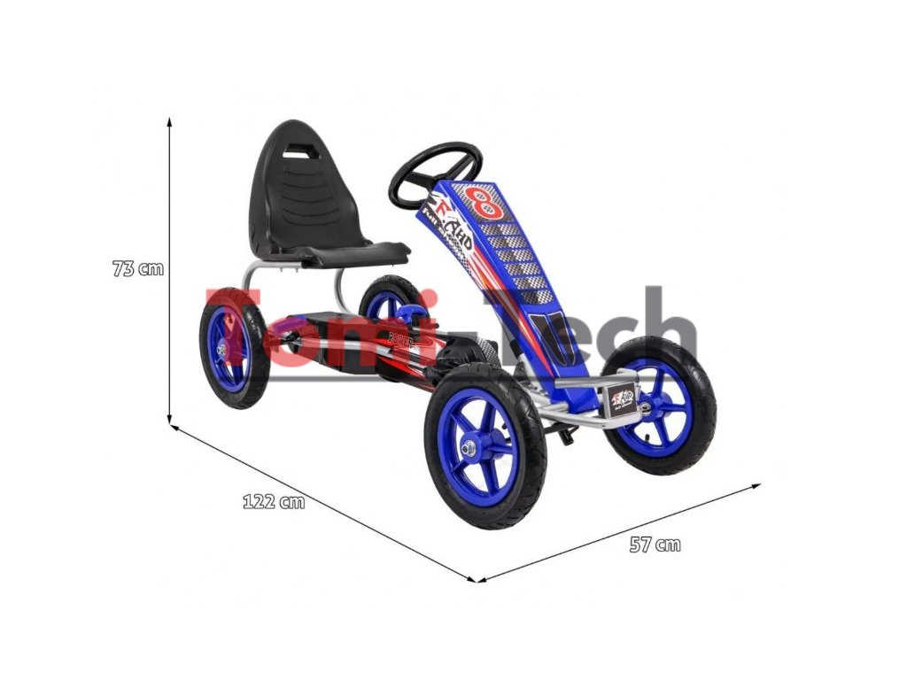 Detská šliapacia motokára s nafukovacími kolesami bola vyrobená z ľahkej kovovej konštrukcie s doplnkami z umelej hmoty. Je vybavená nafukovacími gumovými kolesami a pohodlným, tvarovaným sedákom, ktorý zaistí pohodlie pri jazde.Sedadlo má dvojstupňové nastavenie vzdialenosti od volantu, vďaka čomu sa ľahko prispôsobí výške dieťaťa. Ručná brzda zaistí bezpečné brzdenie.