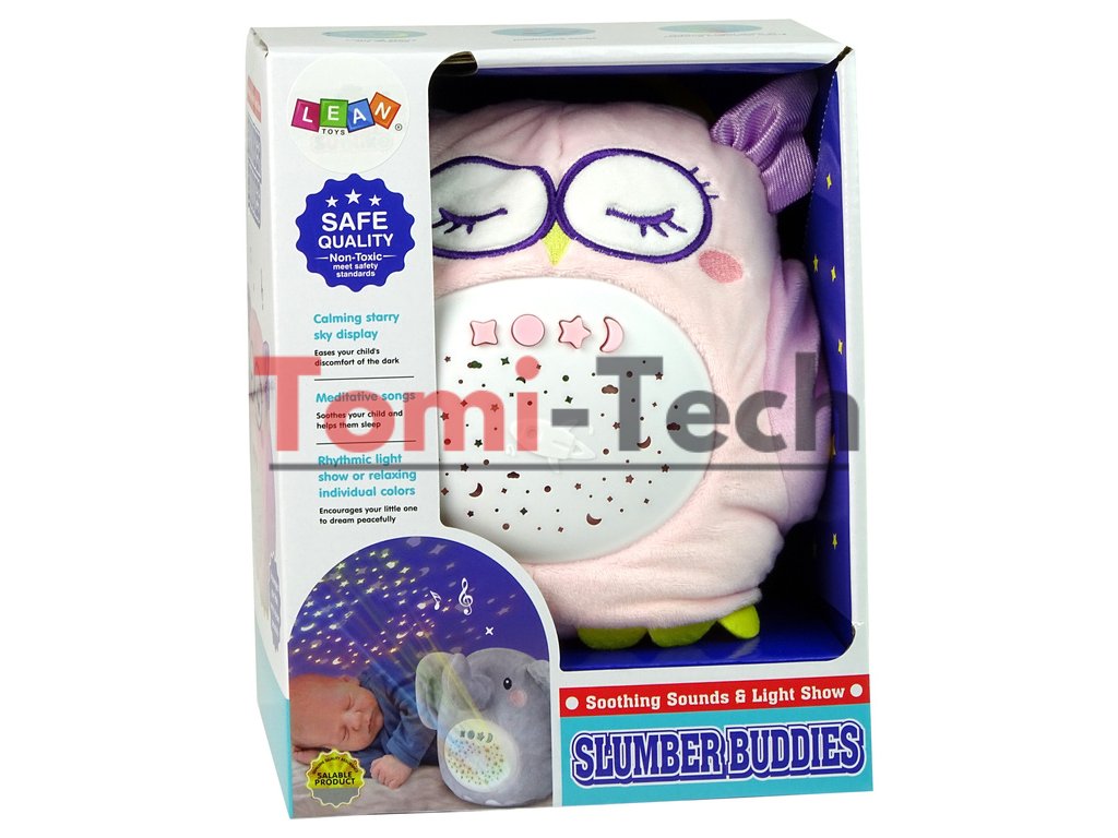 Sova má vstavaný projektor, ktorý premieta na steny alebo strop hviezdičky meniace farbu. Večer vytvorí v detskej izbe harmóniu a magickú atmosféru. Plyšový projektor s hviezdičkami a hudobnou skrinkou je hračka určená pre deti všetkých vekových kategórií.