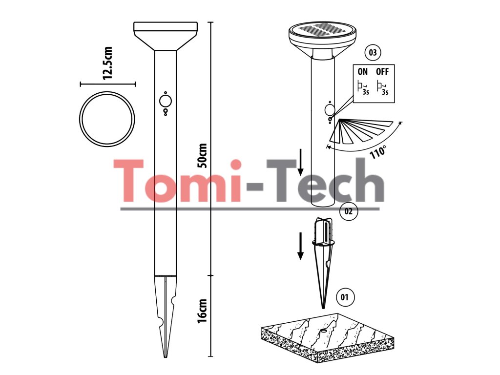 - lampa sa automaticky zapne po zotmení a svieti nepretržite na 10 % výkonu a po detekcii pohybu po dobu 25 sekúnd svieti na 35 % výkonu. Prevádzková doba: 5-6h