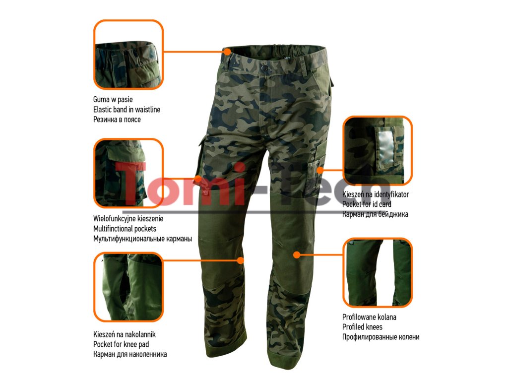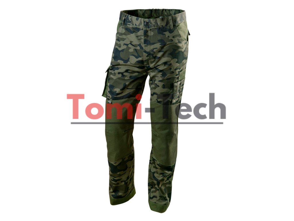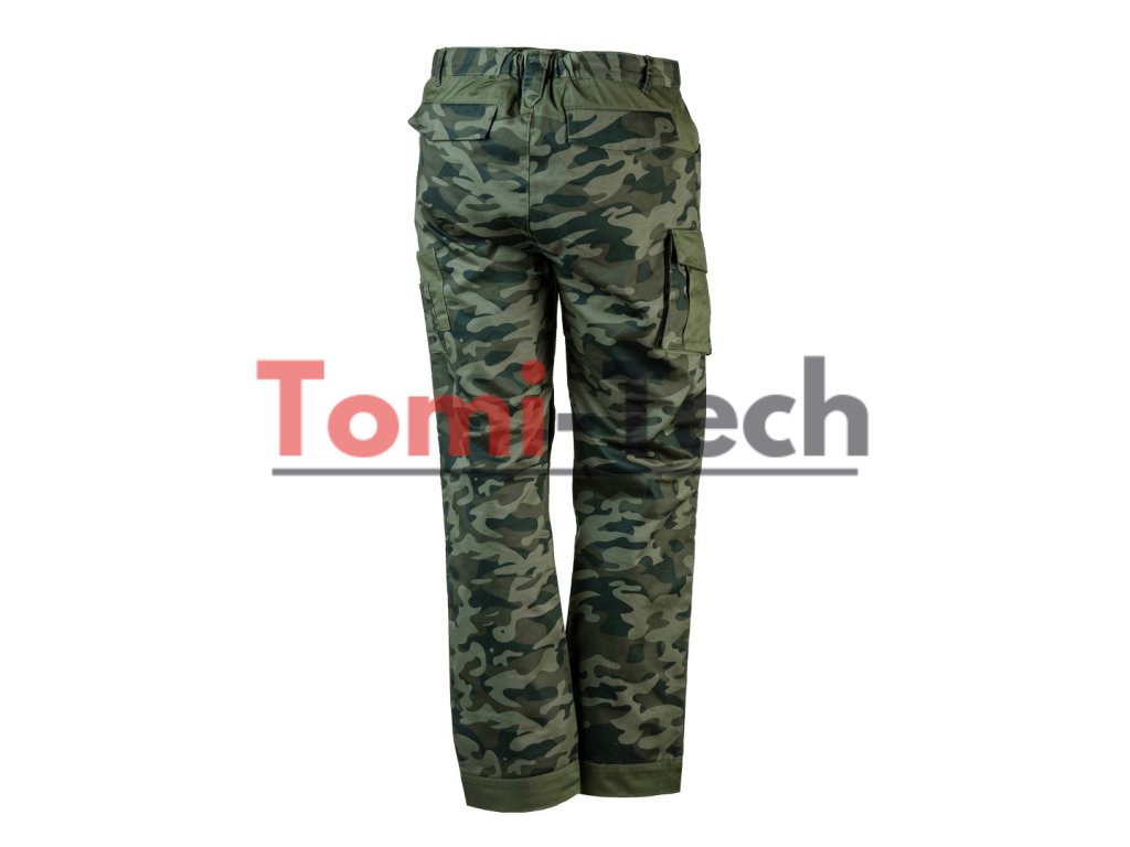 Pracovné nohavice s maskáčovým vzorom, veľkosť XXL, 60 % bavlna, 40 % polyester, 255 g/m2, multifunkčné vrecká, vrecko na identifikačné údaje, vystužené kolená s vreckami na chrániče kolien, tvarované kolená, elastický pás, trojité šitie, identifikačná vložka, unikátny maskáčový vzor, certifikácia CEDodatočné parametre