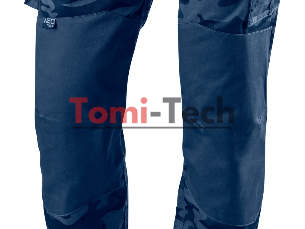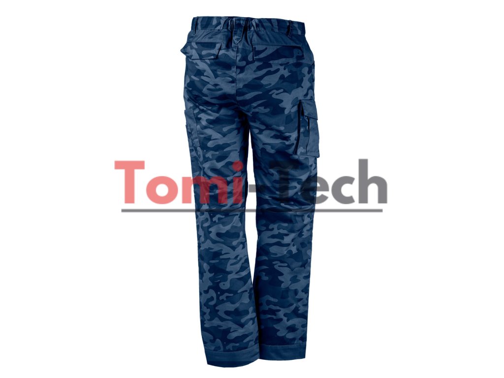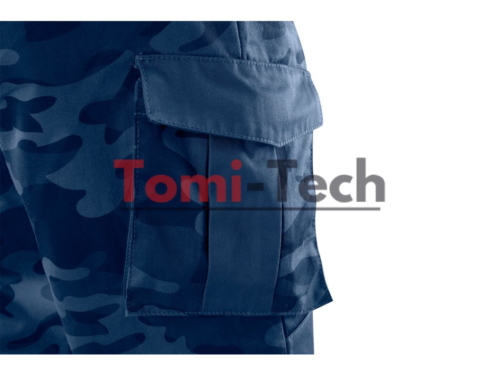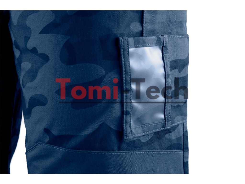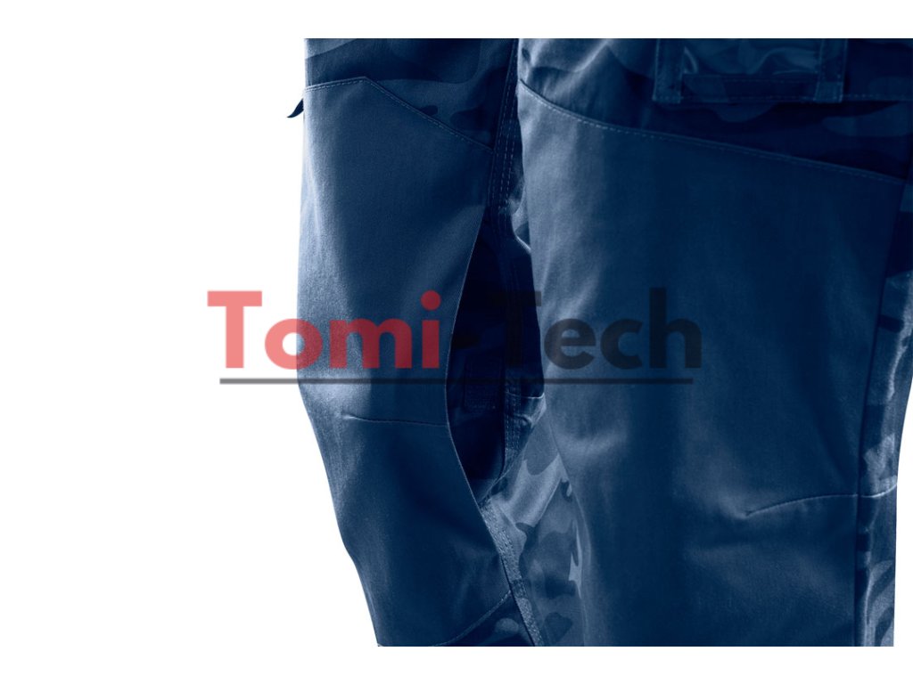 Pracovné nohavice CAMO Navy, zloženie: 60 % bavlna, 37 % polyester, 3 % elastan, jedinečný vzor v odtieňoch modrej, multifunkčné vrecká, vrecko na preukaz totožnosti, vystužené kolená s vreckom na chrániče kolien, profilované kolená, elastický pás, trojité šitie, vložka na preukaz totožnosti, veľkosť XXXLDodatočné parametre