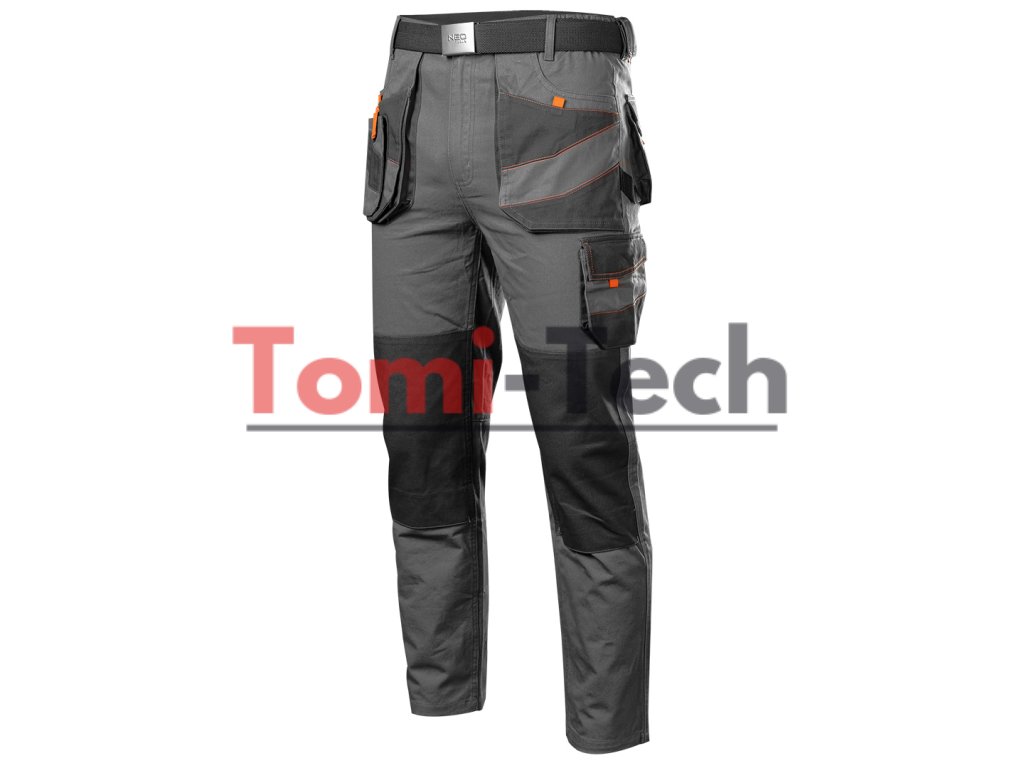 Pracovné nohavice, 100 % bavlna, gramáž 260 g/m2, vyrobené z keprovej bavlnenej tkaniny pre vysokú odolnosť a odolnosť proti roztrhnutiu, elastický pás, opasok súčasťou balenia, multifunkčné a priestranné vrecká, vrecká na chrániče kolien, vnútorná menovka, certifikát CE, veľkosť XLDodatočné parametre