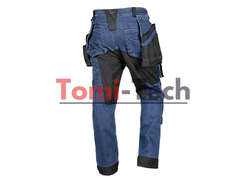 Pracovné nohavice z džínsoviny, s výstužou z Cordury, veľkosť L, zloženie materiálu: 82 % bavlna, 16 % polyester, 2 % elastan, gramáž: 400 g/m2, tmavomodrá, multifunkčné vrecká s výstužami, elastický pás, pútko na náradie, výstuhy na vreckách, kolenách, dolnej časti nohavíc a chrbte, vrecká na chrániče kolien, profilované kolená, odnímateľné vrecká s puzdrom, menovka, certifikát CEDodatočné parametre