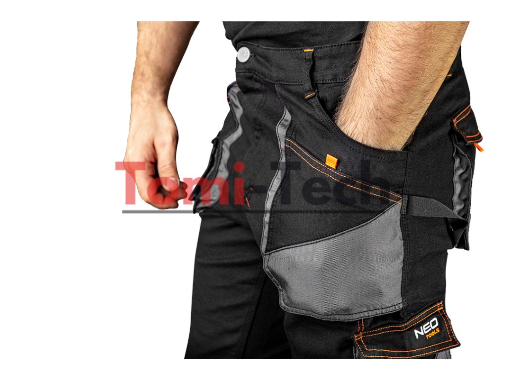 Pracovné nohavice HD Slim, opasok, zloženie materiálu 60% bavlna, 37% polyester, 3% elastan, gramáž 285 g/m2, pridanie elastanu zaisťuje lepšie padnutie a väčšie pohodlie pri nosení, unikátny strih Slim fit, priliehavý k telu, dodatočné výstuhy z oxfordskej látky v miestach najviac vystavených oderu, multifunkčné a priestranné vrecká, profilované koleno, vnútorná menovka, bavlnený opasok s kovovou prackou, reliéfne logo NEO Tools, vrecká na kolenách, trojité šitie, možnosť predĺženia nohavíc, reflexné prvky, certifikát CE veľkosť LDodatočné parametre