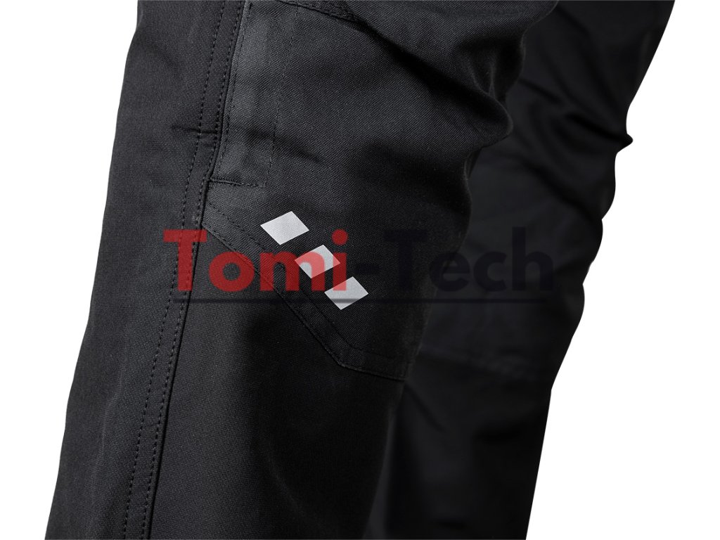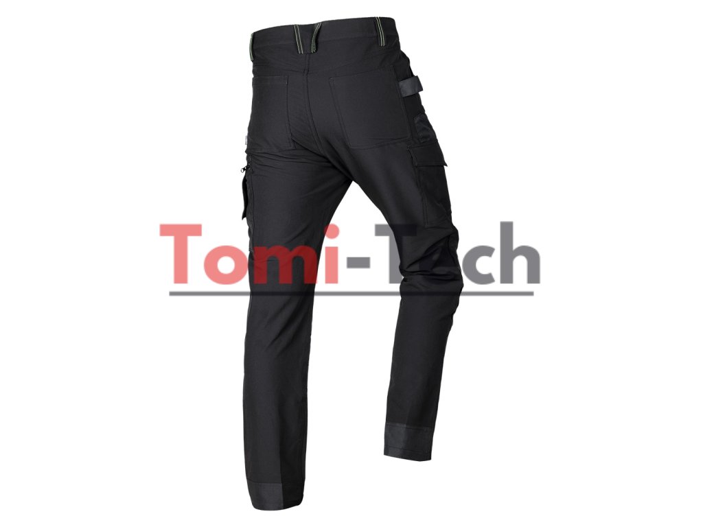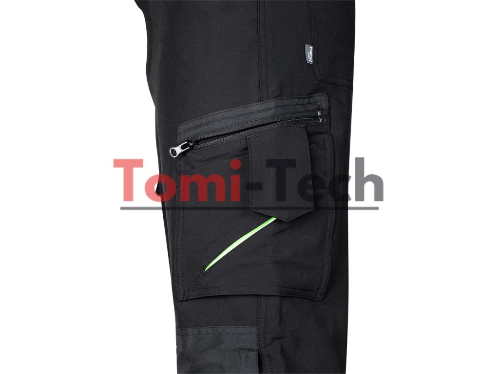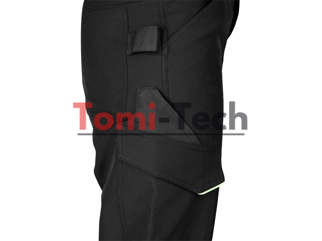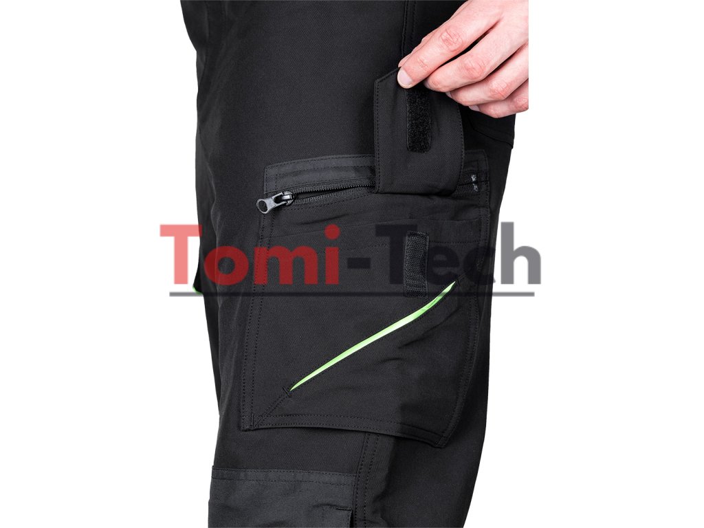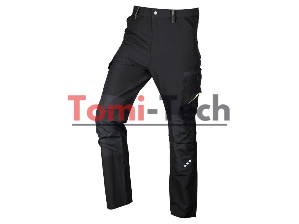 Pracovné nohavice Mix&Match vyrobené zo 4-cestnej strečovej tkaniny, materiálové zloženie 92% polyester 8% spandex, gramáž 230g/m2, čierna farba so zelenými prvkami, dvojité šitie, vystužené kolená s priestorom pre chrániče kolien, vystužené dolné časti nohavíc, tvarované kolená, reflexná potlač, pútko na náradie, menovka, certifikát CE EN ISO 13688:2013, veľkosť XLDodatočné parametre
