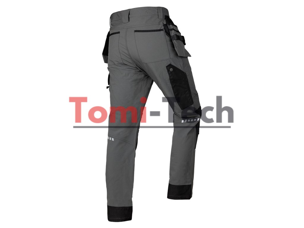 Pracovné nohavice Mix&Match vyrobené zo 4-cestnej strečovej látky s puzdrami na náradie a výstuhami z Cordury, materiálové zloženie 91% nylon 9% spandex, gramáž 230g/m2, sivo-čierne, reflexné prvky na kolenách vpredu a vzadu, bočné vrecko s pútkami na náradie, bočné vrecká na zips, odnímateľné bočné vrecká na zips, výstuž z Cordury na vrecku na náradie, bočnom vrecku, kolenách a dolnej časti nohavíc, menovka, certifikát CE EN ISO 13688:2013, veľkosť LDodatočné parametre
