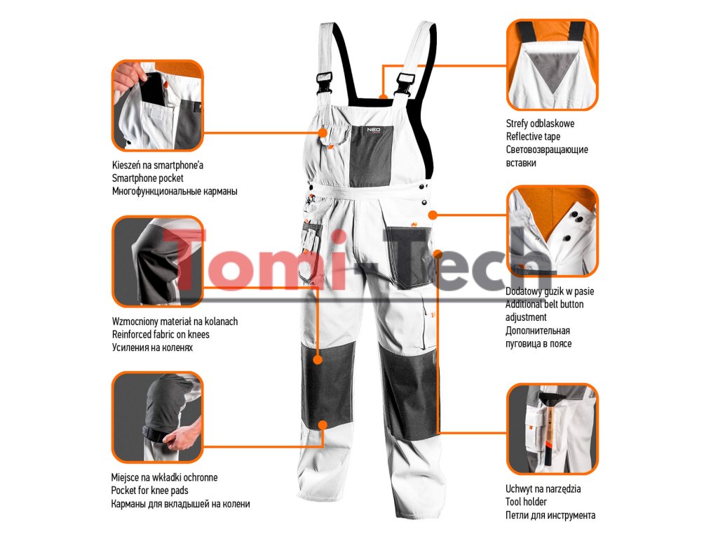 Pracovné nohavice s náprsníkom, biele, veľkosť LD/54, 35 % bavlna, 65 % polyester, 267 g/m2, výstuhy z oxfordskej tkaniny, vystužené vrecká, reflexný prvok na chrbte, trojité šitie, možnosť vložiť chrániče kolien, CE, EN ISO 13688:2013Dodatočné parametre