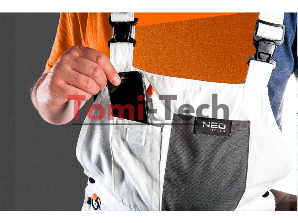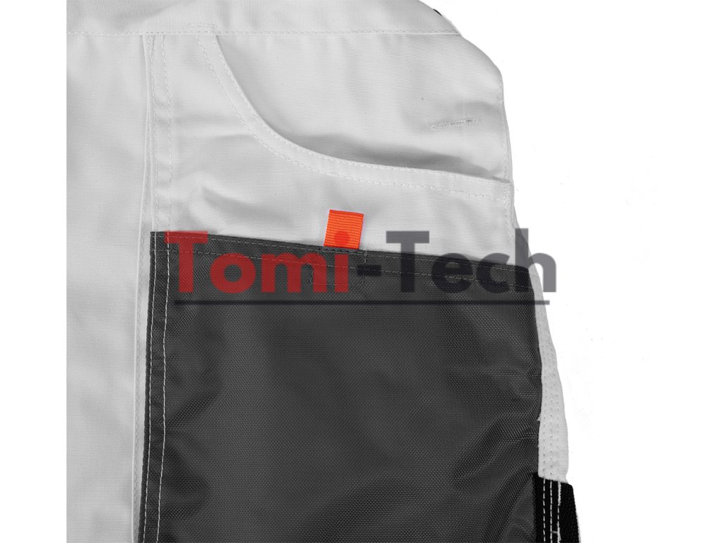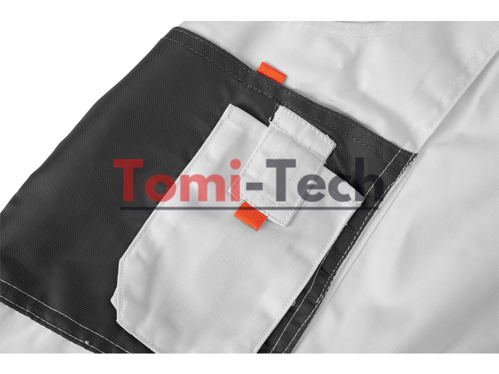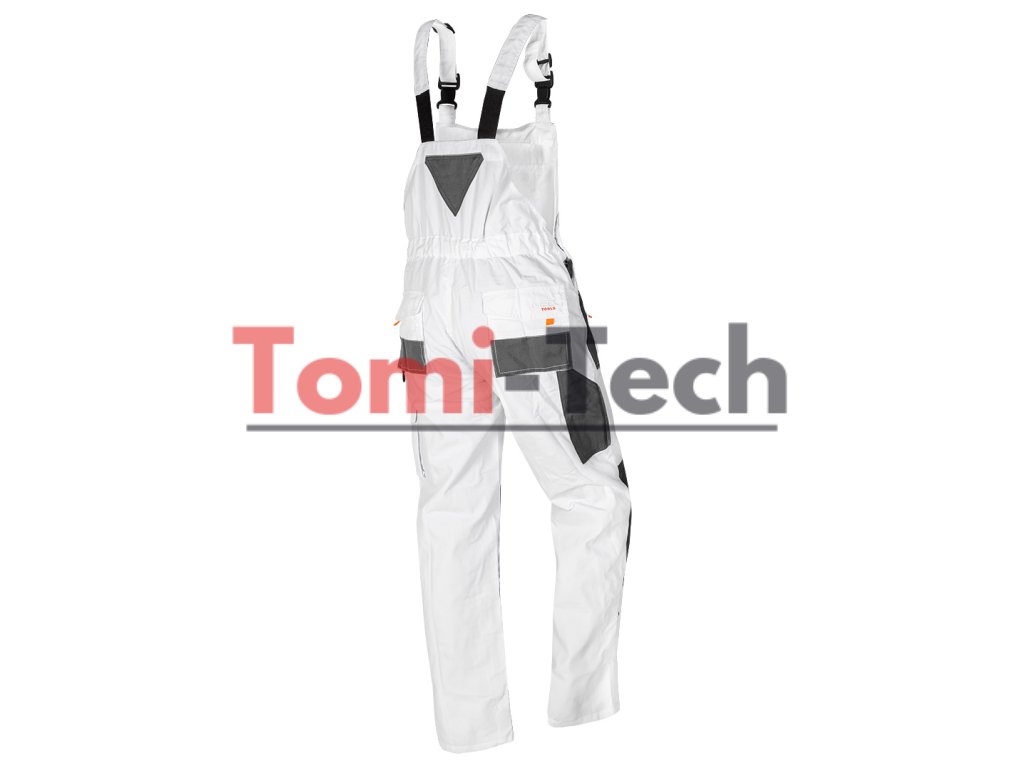 Pracovné nohavice s náprsníkom, biele, veľkosť M/50, 35 % bavlna, 65 % polyester, 267 g/m2, výstuhy z oxfordskej tkaniny, vystužené vrecká, reflexný prvok na chrbte, trojité šitie, možnosť vložiť chrániče kolien, CE, EN ISO 13688:2013Dodatočné parametre