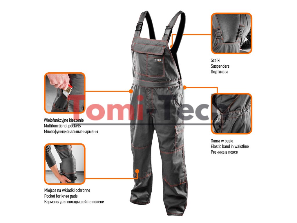 Pracovné nohavice s náprsníkom L/54, 35 % bavlna, 65 % polyester, 245 g/m2, multifunkčné vrecká, elastický pás, možnosť vloženia penových chráničov kolien, CE, EN ISO 13688:2013Dodatočné parametre