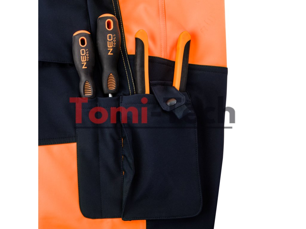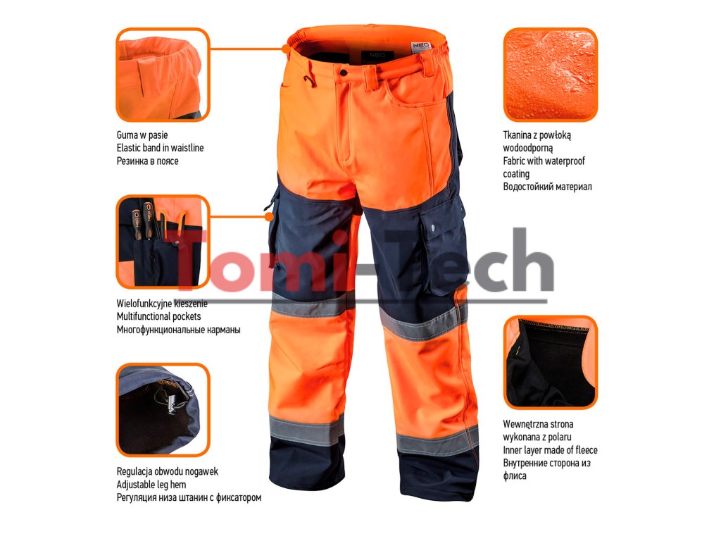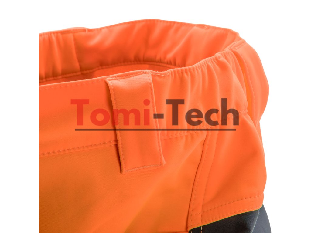 Pracovné nohavice zo softshellu s vysokou viditeľnosťou, oranžové, veľkosť XXL, trieda 1 podľa EN ISO 20471, vodeodolnosť 8000 mm, priedušný materiál, elastický pás, viacero vreciek, nastaviteľné manžety na nohaviciach, certifikát CE, EN ISO 13688:2013Dodatočné parametre