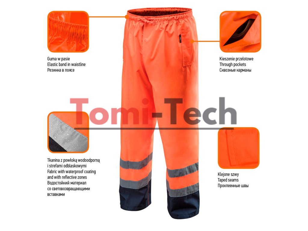 Nepremokavé, oranžové, veľkosť XXL, pracovné nohavice s vysokou viditeľnosťou, trieda 1 podľa EN ISO 20471, tkanina 300D Oxford, priechodné vrecká, elastický pás, podlepené švy, vodeodolné a vetruodolné, CE, EN ISO 13688:2013Dodatočné parametre