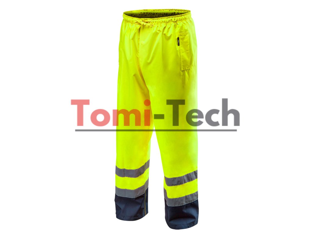 Nepremokavé, žlté, vysoko reflexné pracovné nohavice, veľkosť XL, trieda 1 podľa EN ISO 20471, tkanina 300D Oxford, priechodné vrecká, elastický pás, podlepené švy, vodeodolné a vetruodolné, CE, EN ISO 13688:2013Dodatočné parametre