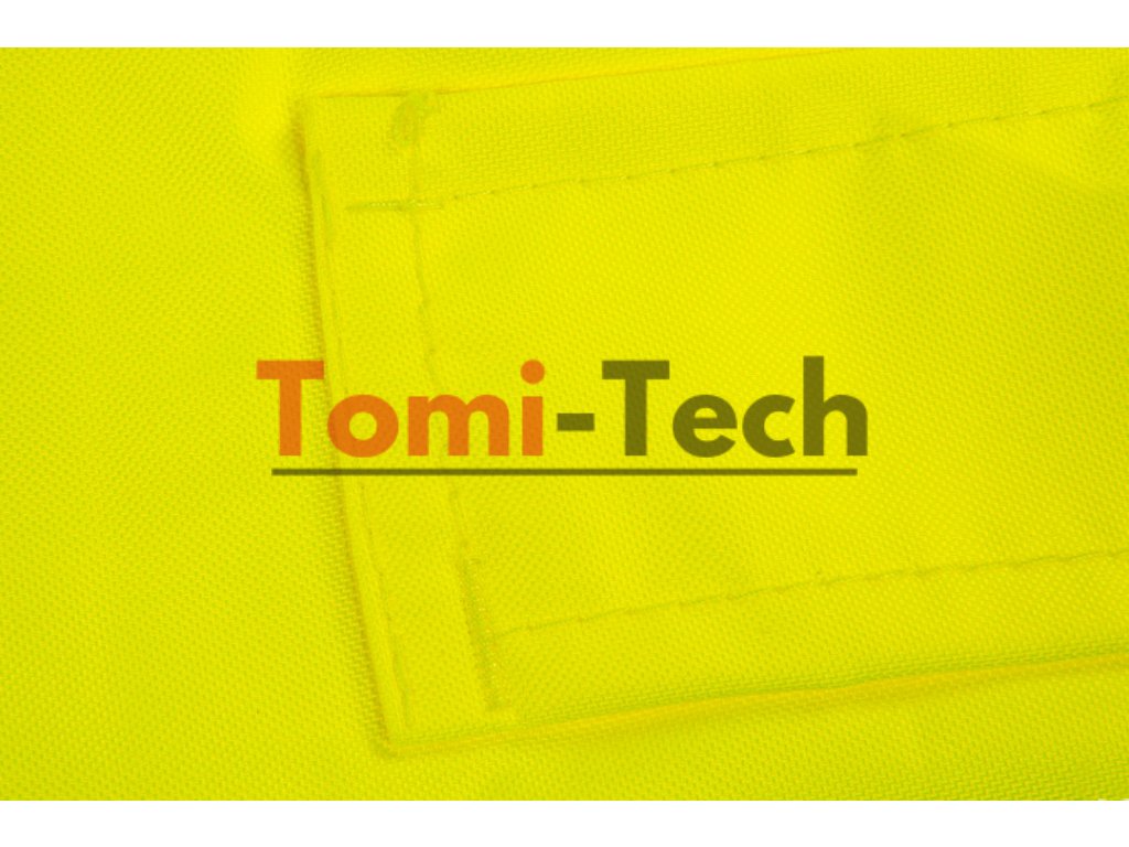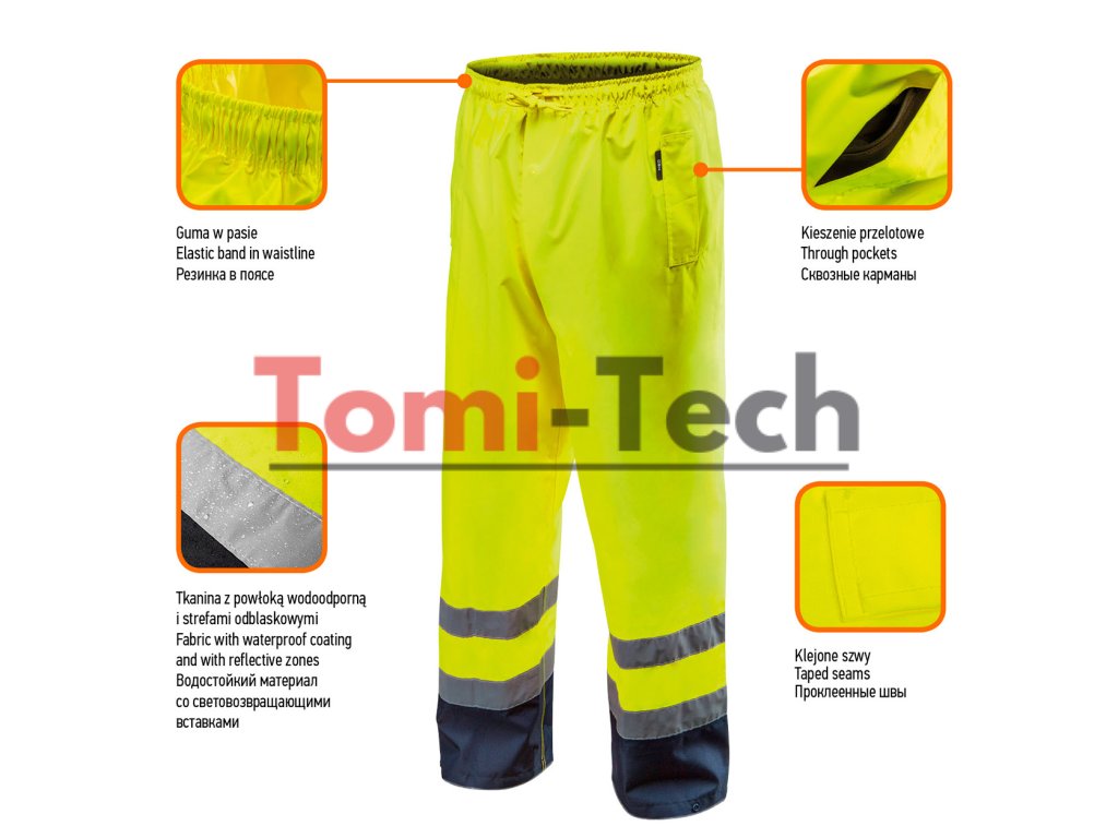 Nepremokavé, žlté, vysoko reflexné pracovné nohavice, veľkosť XXL, trieda 1 podľa EN ISO 20471, tkanina 300D Oxford, priechodné vrecká, elastický pás, podlepené švy, vodeodolné a vetruodolné, CE, EN ISO 13688:2013Dodatočné parametre